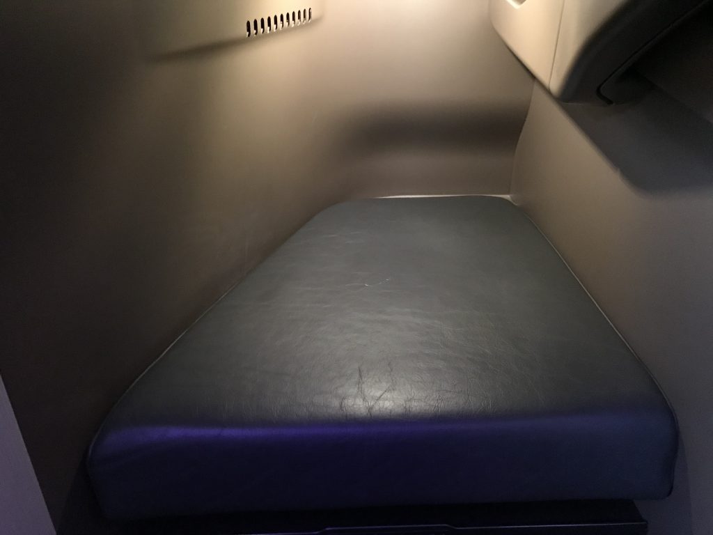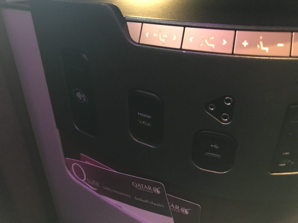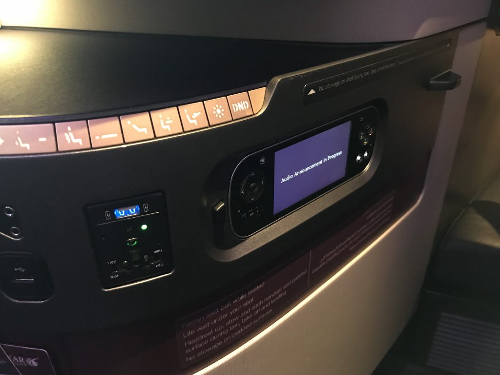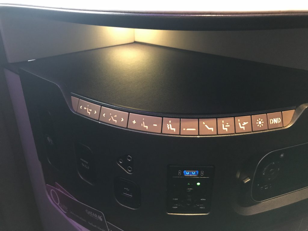 Gegenüber des Ottomanen befindet sich eine großzügige Ablagefläche, auf der bereits Decken, Kissen und Amenity Kit bereit standen. Darunter ist noch einmal ein kleines Staufach, wo man z.B. Pass oder elektronische Geräte ablegen kann. Unter der Ablagefläche ist die Leiste, an der man den Stuhl verstellen kann und auch die USB-Anschlüsse und Steckdosen sind hier gut sichtbar angebracht.