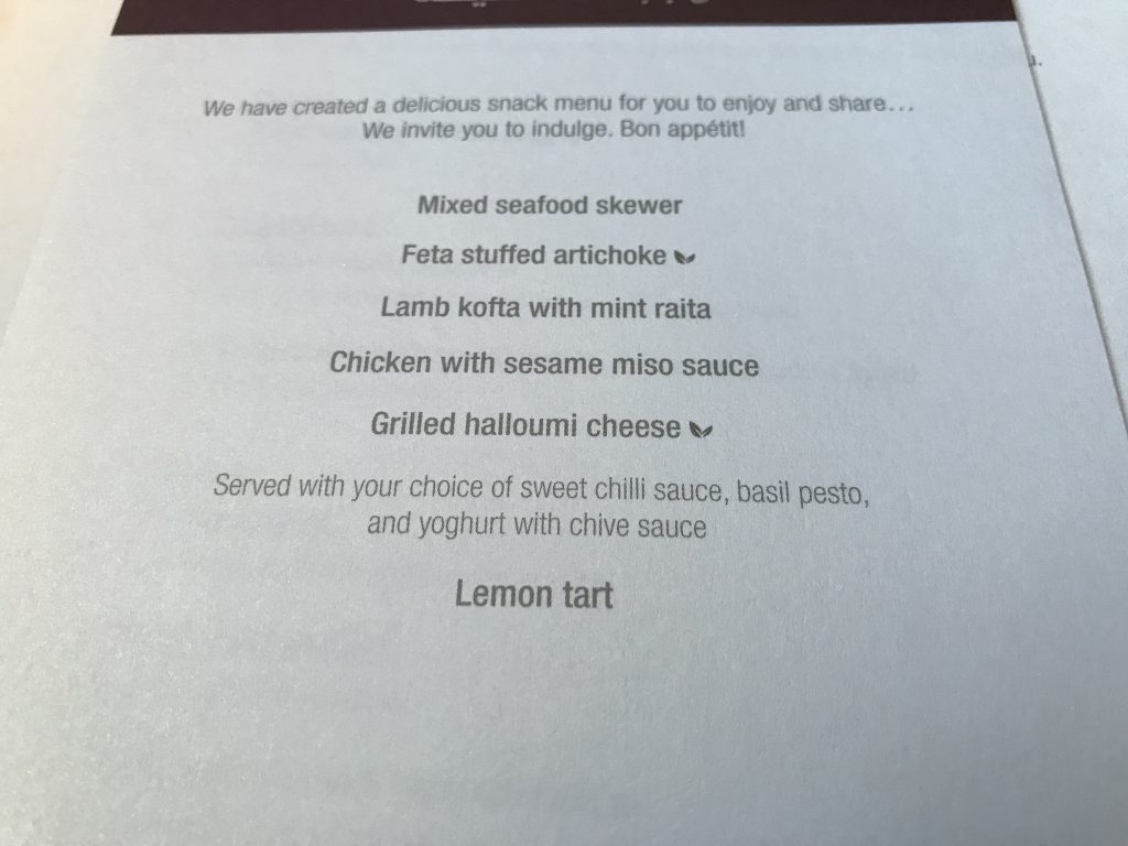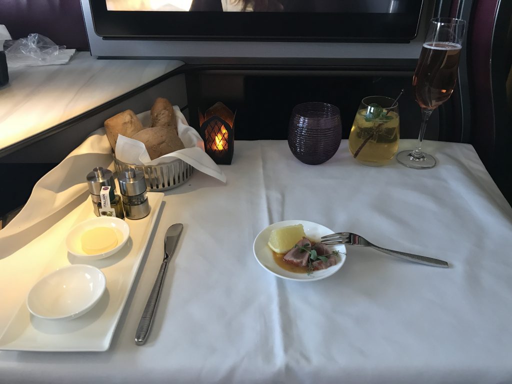 In der QSuite erwartet Euch ein sehr individuelles Servicekonzept. So bietet Qatar ein eine on demand Konzept an, bei dem der Passagier selbst entscheiden kann, wann er essen möchte. Die Crew braucht lediglich 20 Minuten Vorlauf, um alles vorzubereiten. Diesen Service habe ich auch auf diesem Flug genutzt, da ich vor dem Abflug gefrühstückt hatte. Gestartet habe ich mit dem Menü etwa drei Stunden nach Abflug, also ungefähr in der Mitte des Fluges.