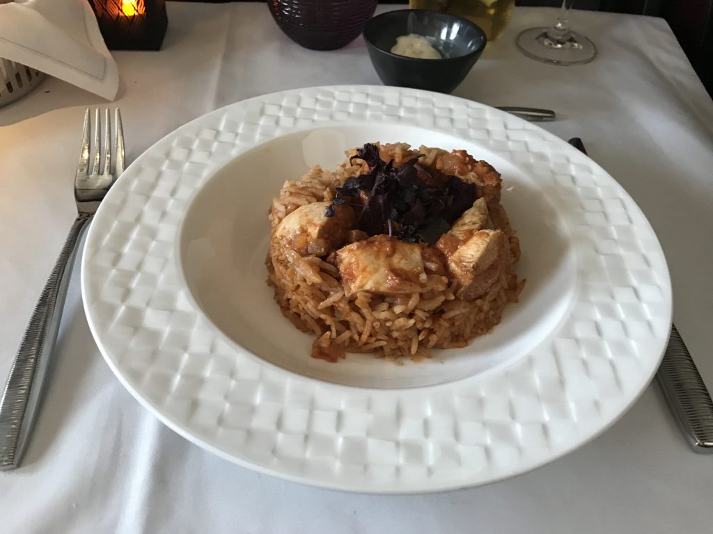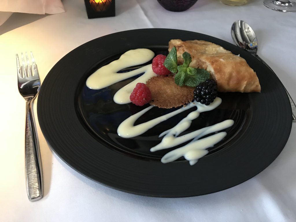 Die Speise- und Getränkekarten boten eine gute Auswahl. Ich entschied mich für zwei alkoholfreie Drinks, beide Vorspeisen 😉 und das Hähnchen zum Hauptgang. Um den Apfelstrudel zum Nachtisch bin ich auch nicht herum gekommen. Zu Beginn des kompletten Menüs wurde ein Gruß aus der Küche (Thunfisch) gereicht, welcher auch sehr lecker war.