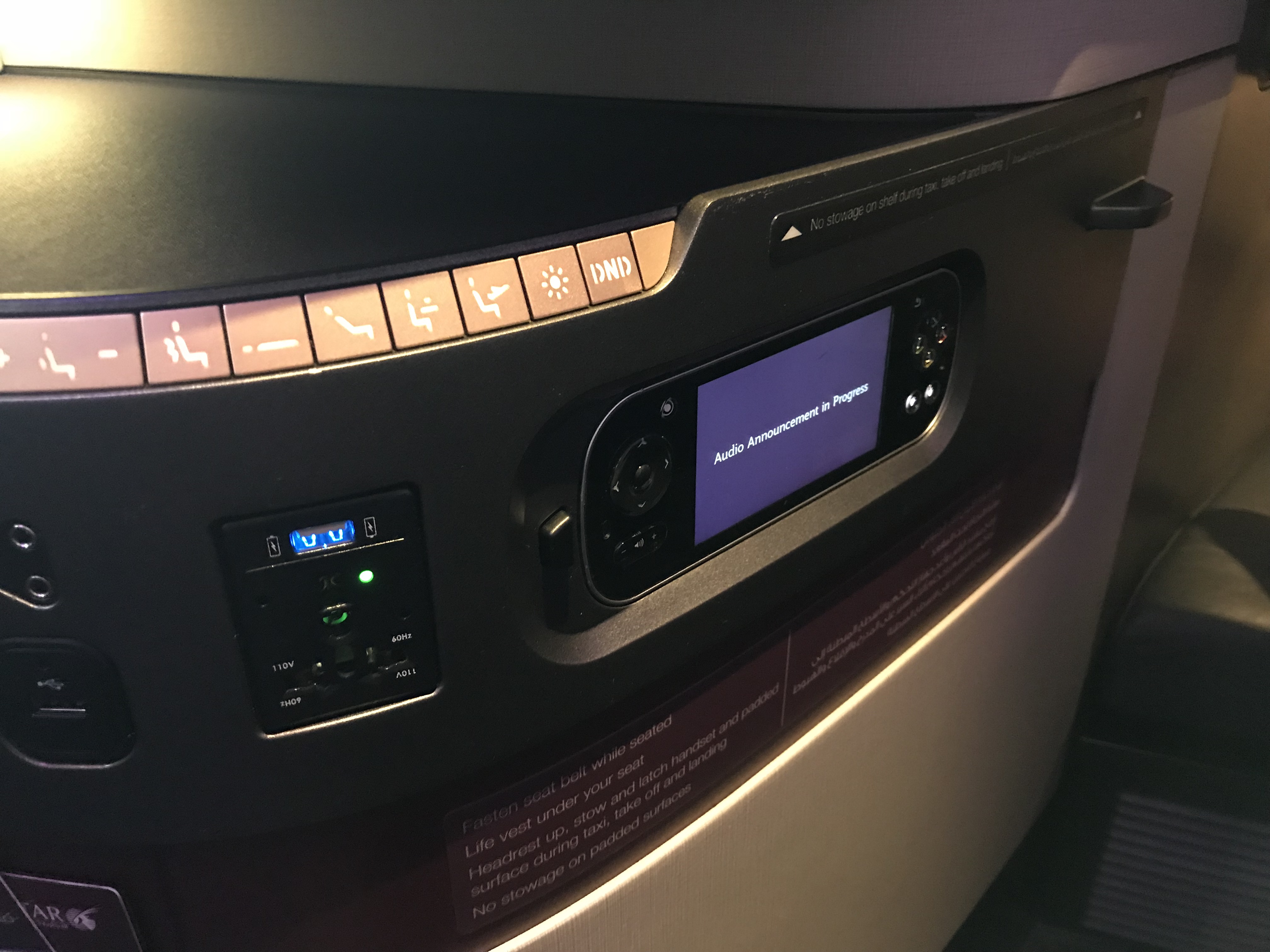 Gegenüber des Ottomanen befindet sich eine großzügige Ablagefläche, auf der bereits Decken, Kissen und Amenity Kit bereit standen. Darunter ist noch einmal ein kleines Staufach, wo man z.B. Pass oder elektronische Geräte ablegen kann. Unter der Ablagefläche ist die Leiste, an der man den Stuhl verstellen kann und auch die USB-Anschlüsse und Steckdosen sind hier gut sichtbar angebracht.