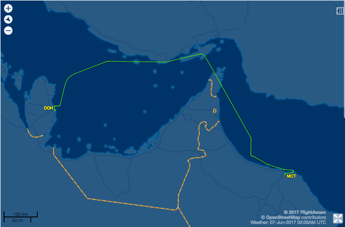 Eine der Möglichkeiten, um beispielsweise aus Dubai nach Doha zu reisen, war ein Flug über Muscat mit Oman Air. Diese Option besteht auch weiterhin, wobei die VAE es jetzt Flügen mit Flugziel Doha, bzw. aus Doha untersagen in Ihren Luftraum einzufliegen. Daher müssen auch Oman Air Flüge aus Muscat nach Doha deutliche Umwege fliegen.