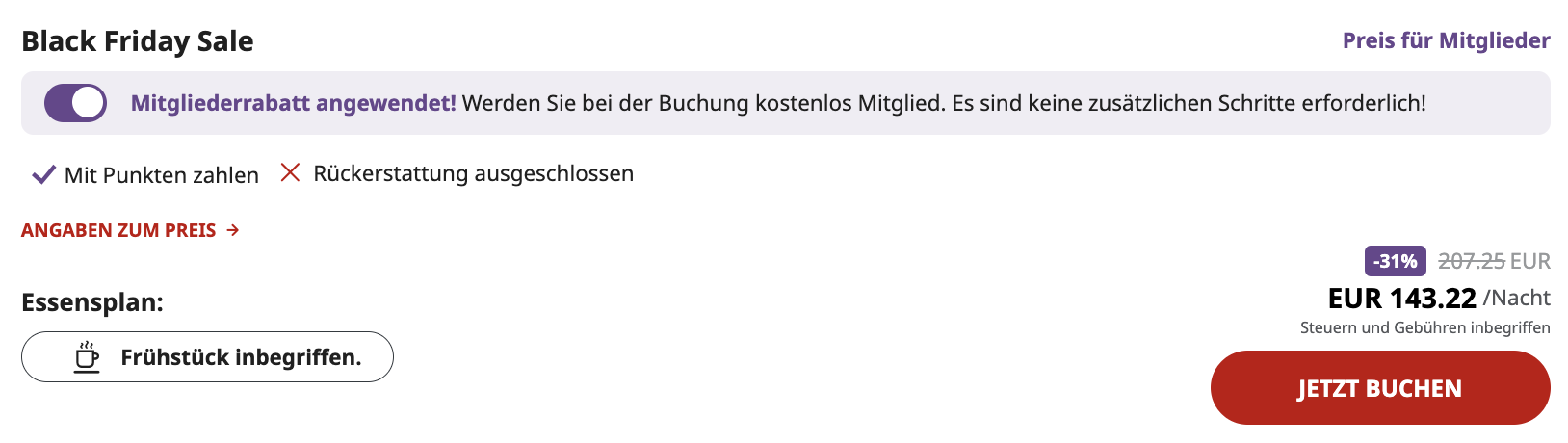 Die Radisson Hotels machen zuverlässig bei den Black Friday- bzw. Cyber Sales mit, viele Häuser gewähren bei einer Buchung bis zum 4. Dezember 2024 bis zu 35 Prozent Rabatt. In den Tarifen ist bereits das Frühstück enthalten, Mitglieder der Radisson Rewards erhalten für jeden Aufenthalt zusätzlich 3.000 Bonuspunkte. Der Aufenthaltszeitraum läuft vom 12. Dezember 2024 über das gesamte Jahr 2025! Wer also nun schon die Termine für einen Urlaub oder Kurztrip im neuen Jahr kennt, sollte einen Blick auf die Homepage werfen.