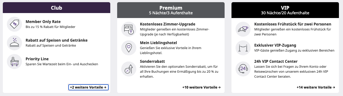 Wer einen Status hat (z.B. durch die American Express Platinum Card) bekommt aber einige Benefits wie erweiterte Check-in / -out Zeiten, Rabatte und Upgrades. Bei dem höchsten VIP-Status gibt es sogar Frühstück, Rabatte und in der Regel bessere und zuverlässigere Upgrades.