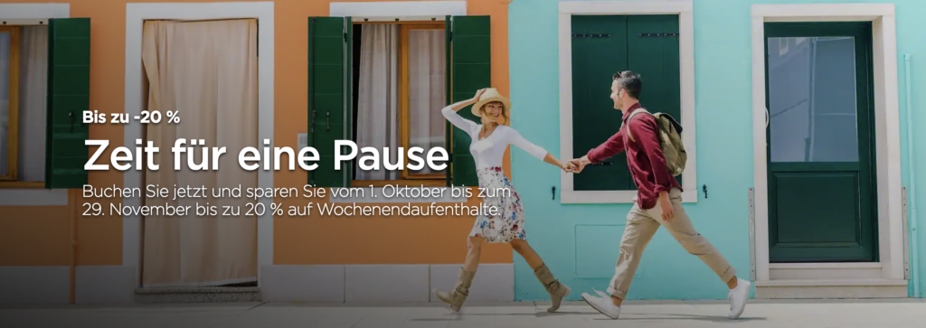 Machen Sie eine Pause und sparen Sie bis zu 20 % auf Wochenendaufenthalte. Erkunden. Sich verwöhnen lassen. Genießen.