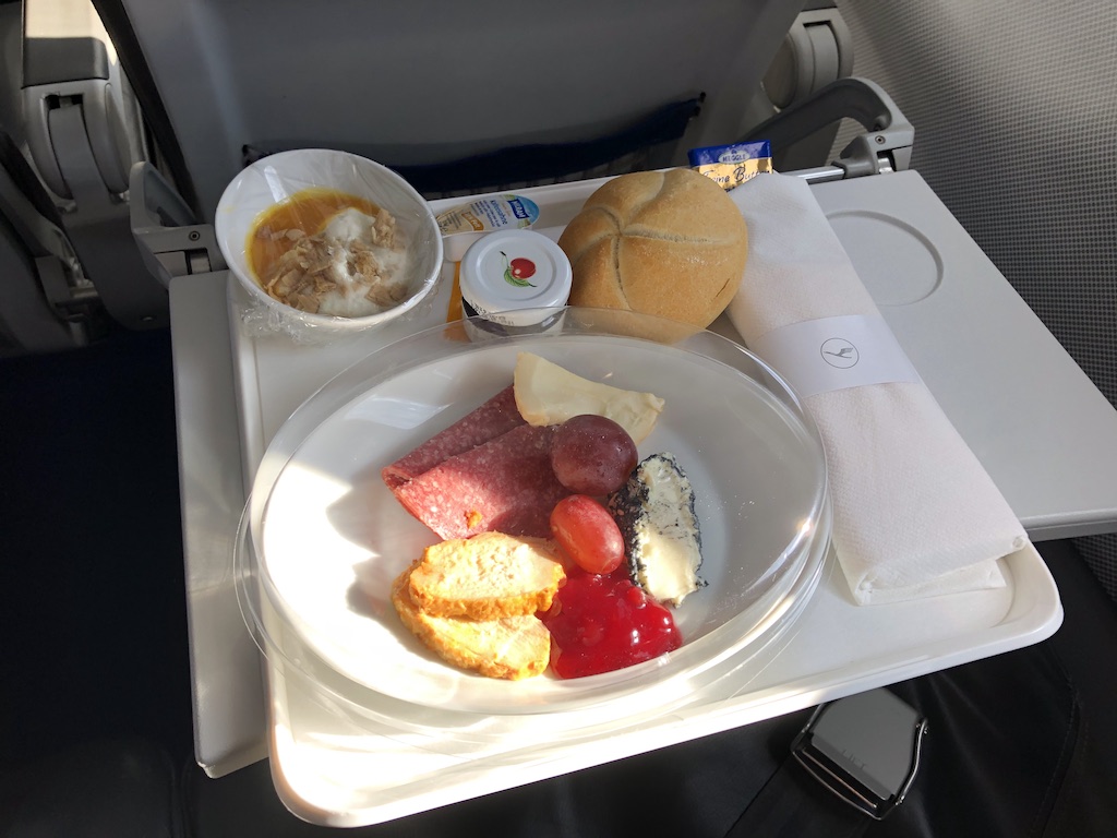 Die Brötchen werden zur Zeit nicht aufgewärmt aus dem Brotkorb gereicht, sondern sind direkt ausgedeckt. Die Crews hatten auf allen Flügen viel Zeit für Smalltalk und Refills. Wie immer sind in der A320 Familie der Mittelsitz und im CRJ der Nebensitz geblockt.