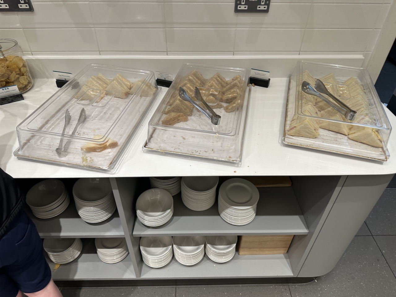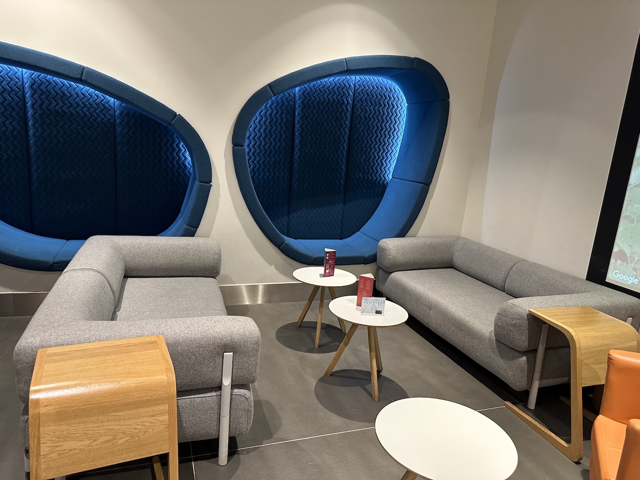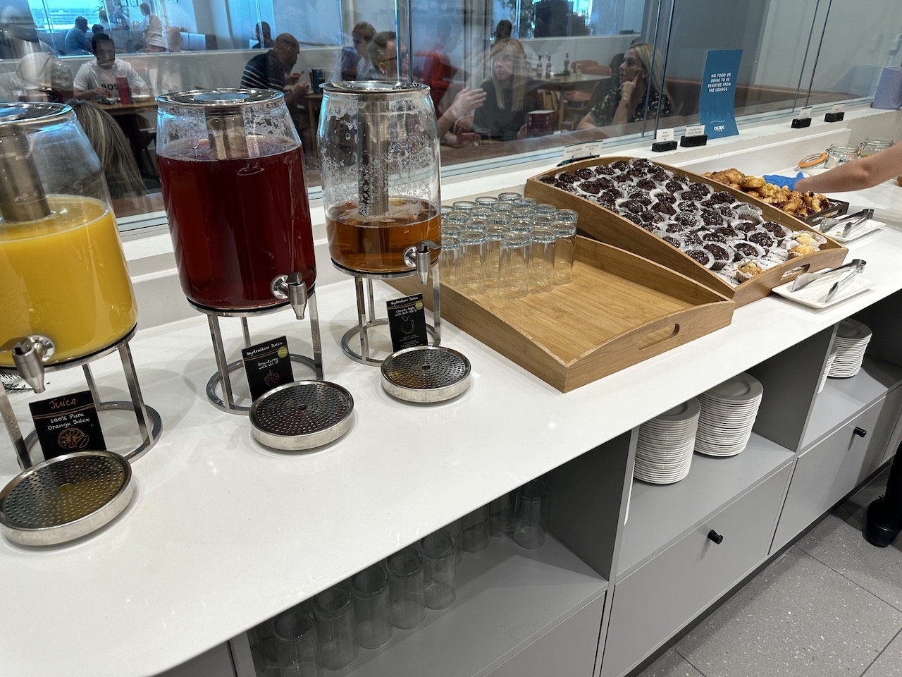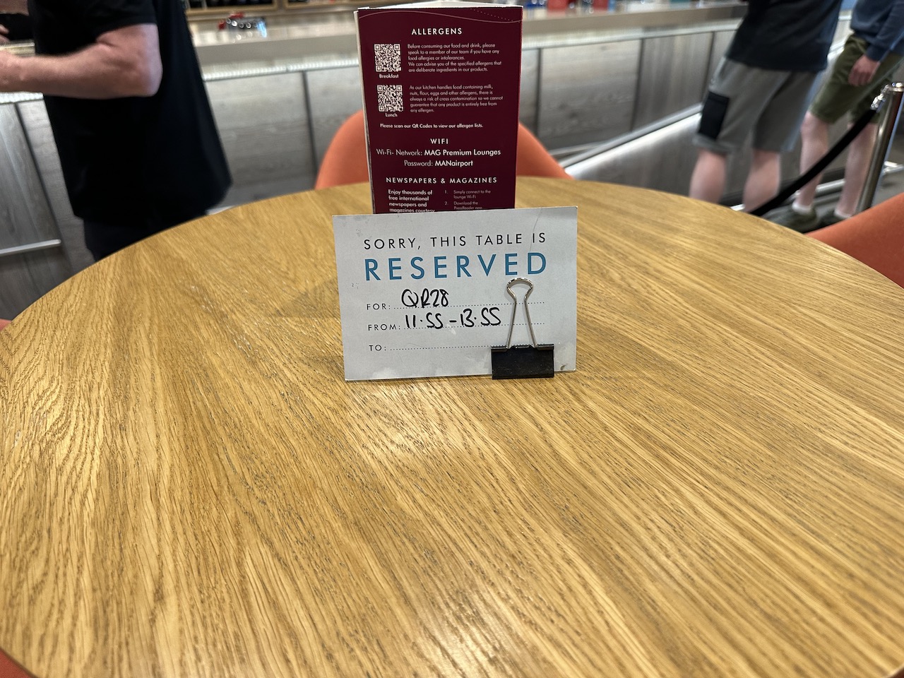 Mit der Stromversorgung war es so eine Sache – die britischen Steckdosen waren etwas rar gesät. Viele Tische waren reserviert und beispielsweise nur für die Premiumkunden von Qatar Airways oder Virgin Atlantic vorgesehen.