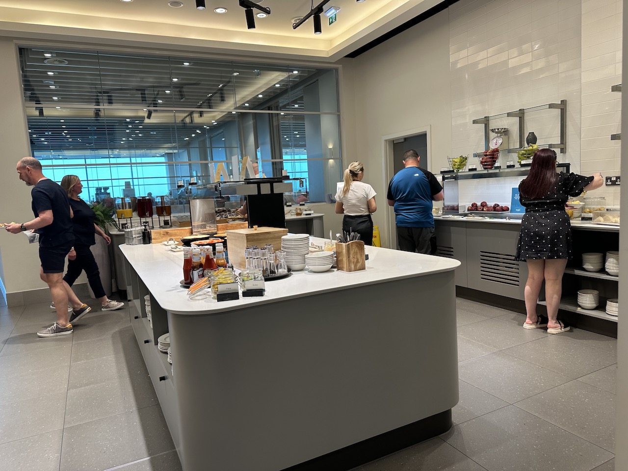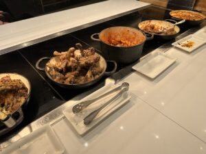 Das etwas kleinere Essensbuffet ist an zentraler Stelle der Lounge und war entsprechend frequentiert.