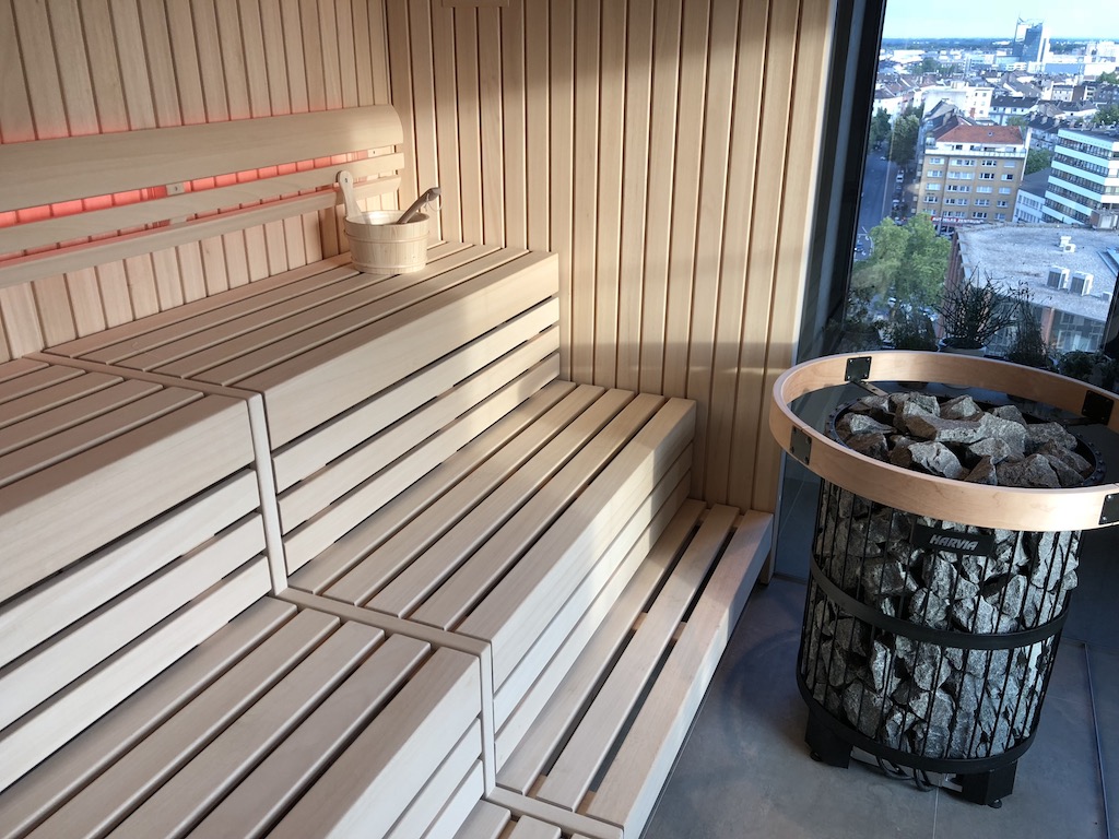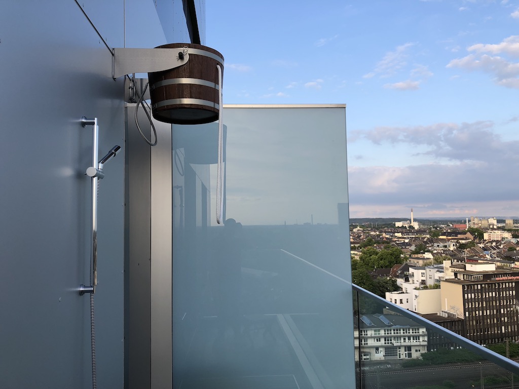 Saunieren ist durch die Lage im hohen Stockwerk ebenfalls mit einem Stadtblick möglich. Leider war die Sauna jedoch während meines Aufenhaltes nicht in Betrieb. Eine Abkühlung im Anschluss kann dafür unter freiem Himmel genomen werden.