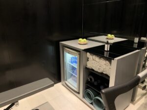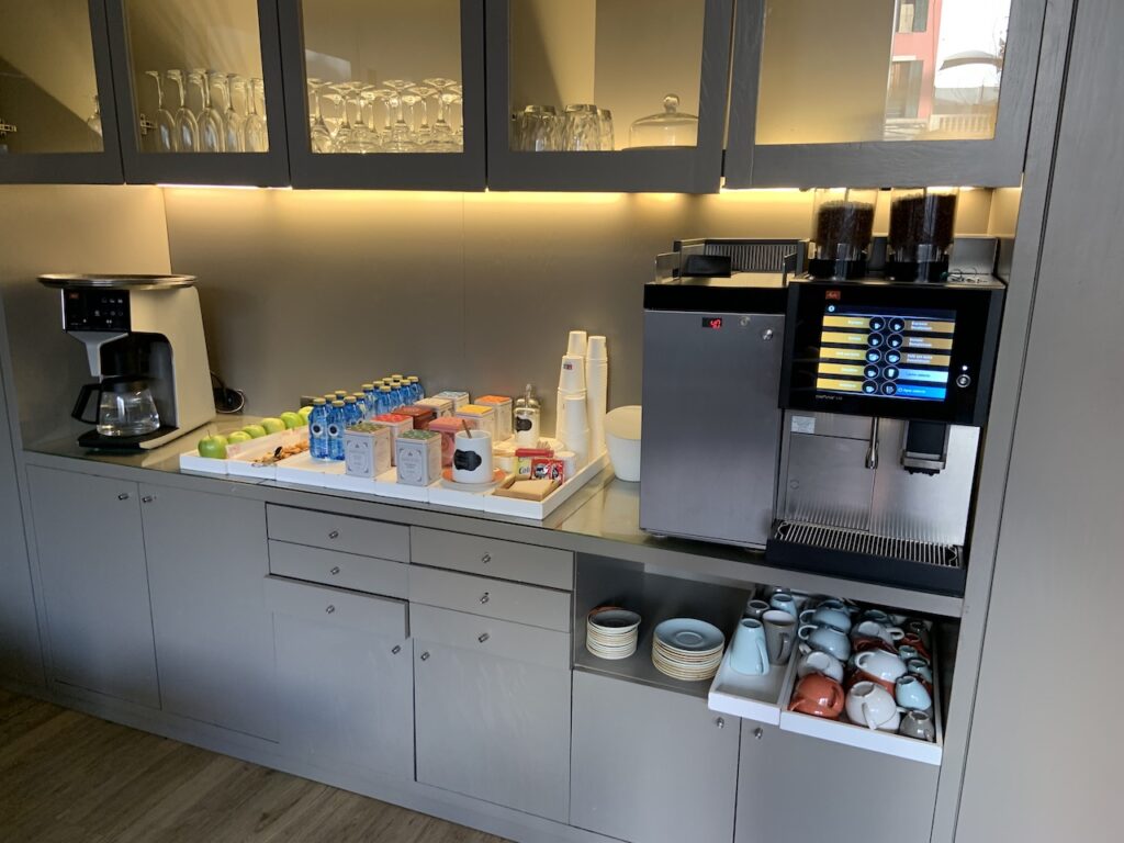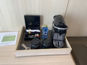 Neben einem Kühlschrank verfügt das Zimmer auch über eine Nespresso Maschine mit Originalkapseln, sowie einem Wasserkocher.
