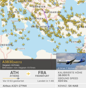 Zur gleichen Zeit war die Maschine, ein neuer A321neo bereits auf dem Weg nach Frankfurt, kam allerdings aus Athen um dann nach Thessaloniki zu fliegen.