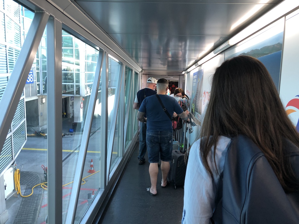 Dem Boardingverfahren kann man gerade in Sachen Covid etwas positives abgewinnen. So sitzt noch niemand (zb. vorne oder in der Business) während die meisten Passagiere im Gang stehen und warten weiterzukommen