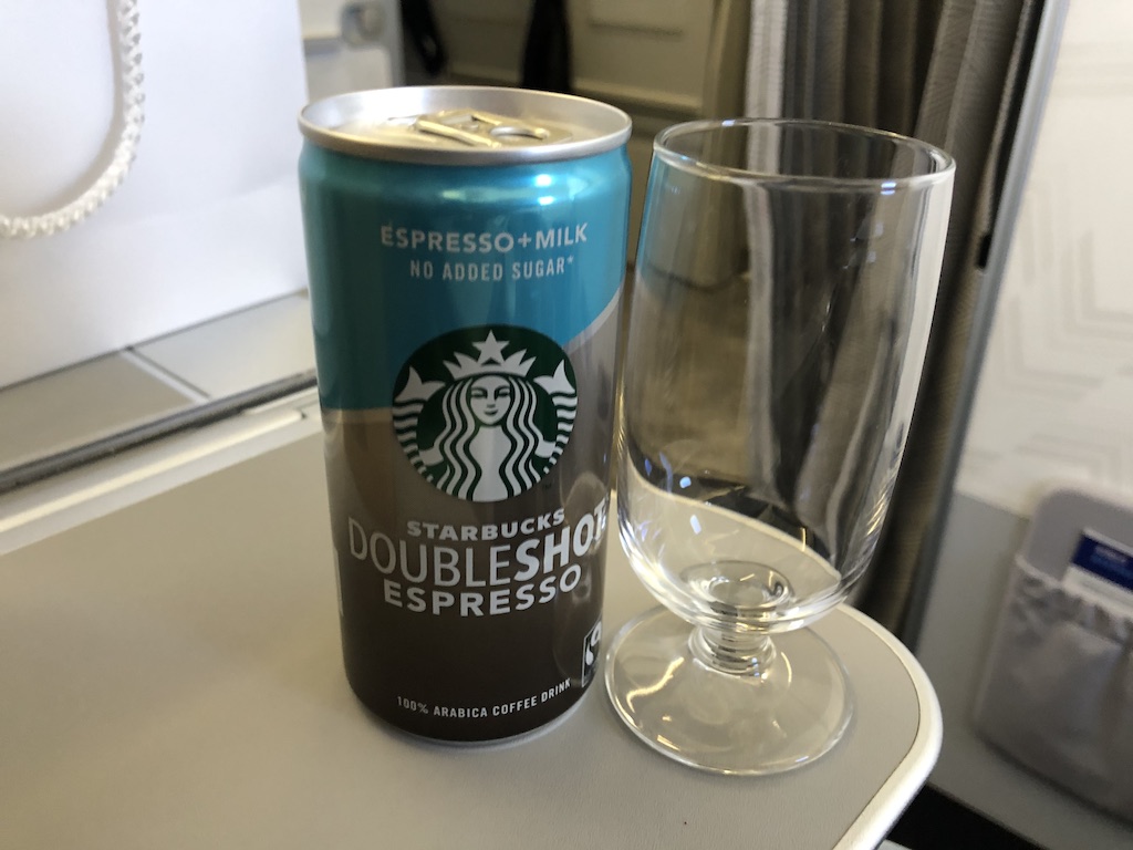 Positiv zu erwähnen ist die Espressomaschine an Bord. Darüberhinaus wurden auf diesem Flug am Morgen auch fertige Kaffee-Getränke von Starbucks serviert. Während des Fluges wurden immer wieder Getränke abgefragt. Weine werden jetzt in 0,2-Liter Fläschchen verteilt. Sekt aus Griechenland gibt es aus 0,375-Liter Flaschen, der uns direkt auf den Tisch gestellt wurde.