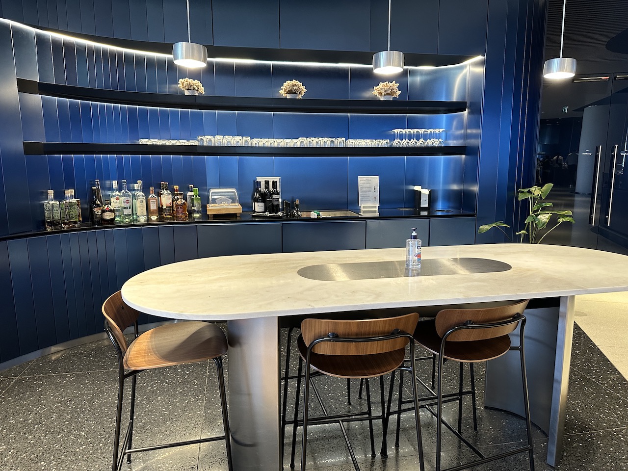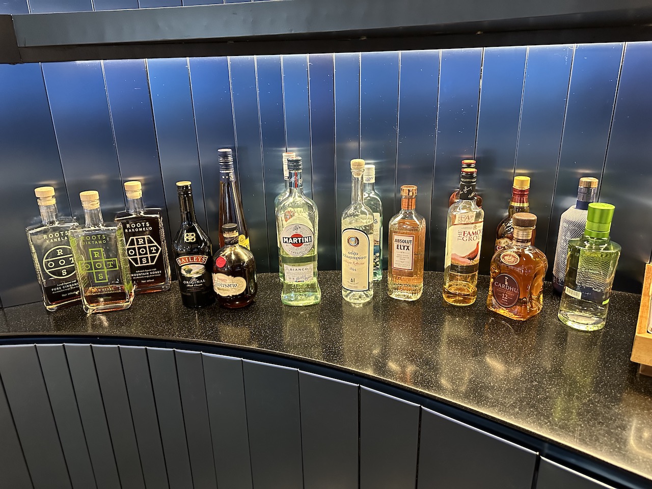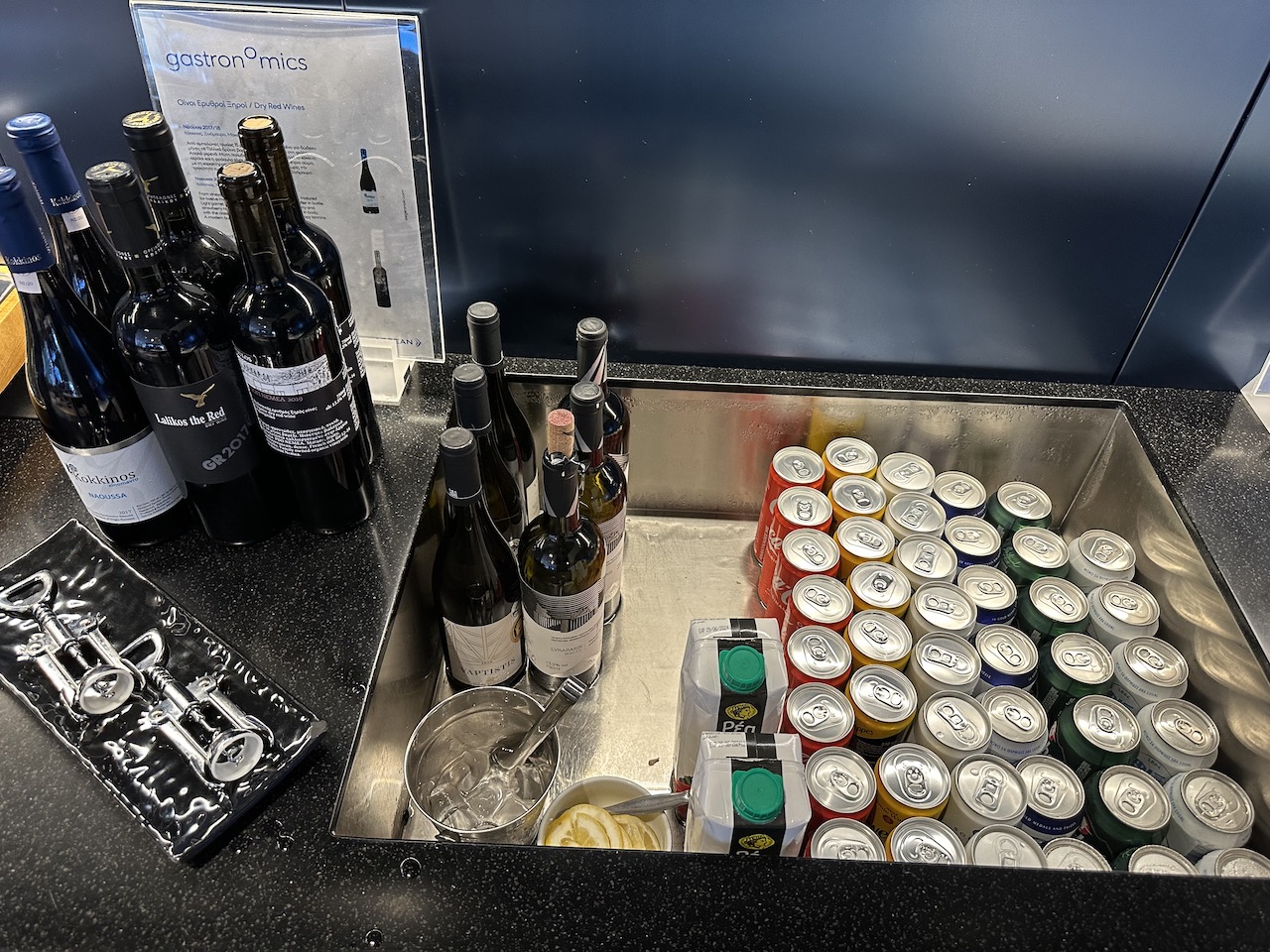 Getränke sind an insgesamt drei Stationen in der Lounge verteilt, an einer stehen Alkoholika bereit. Im Sortiment sind Bier, Wein und Spirituosen, Sekt oder Champagner gibt es nicht.