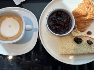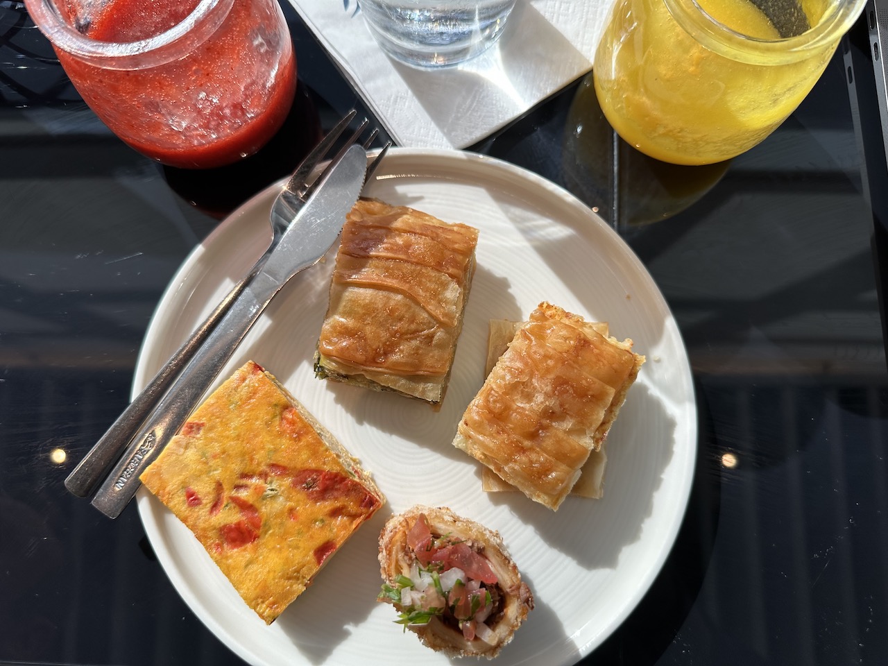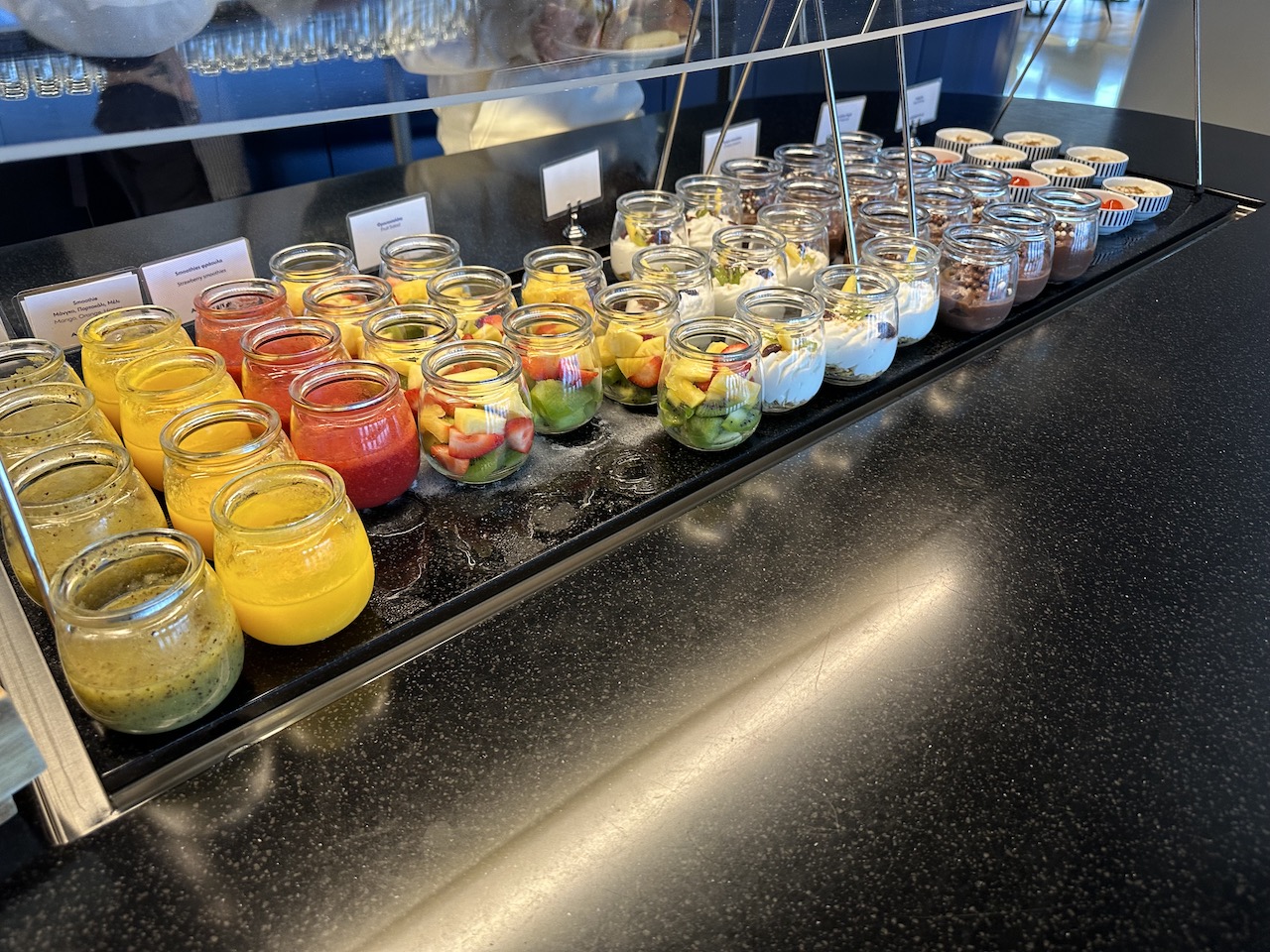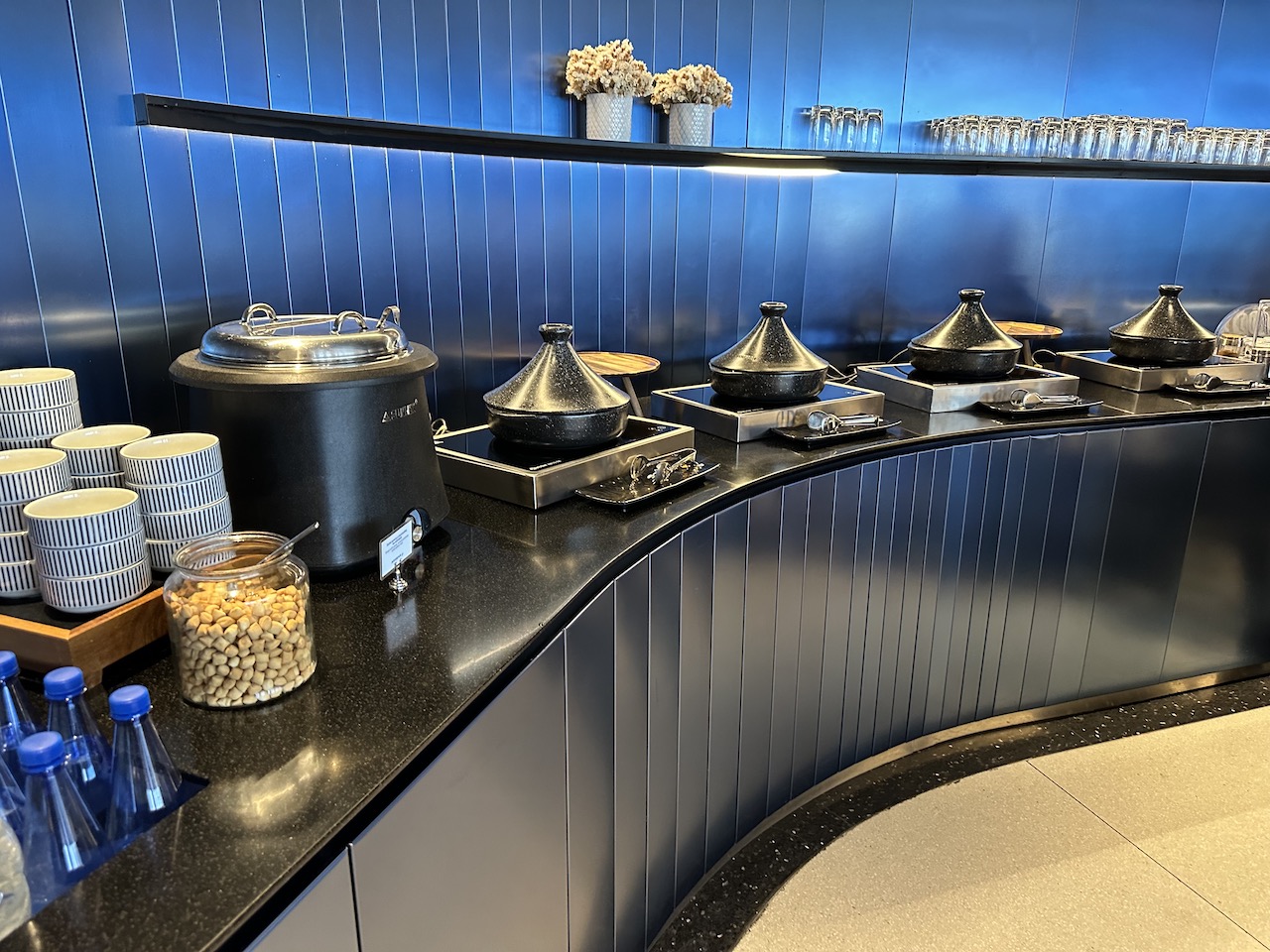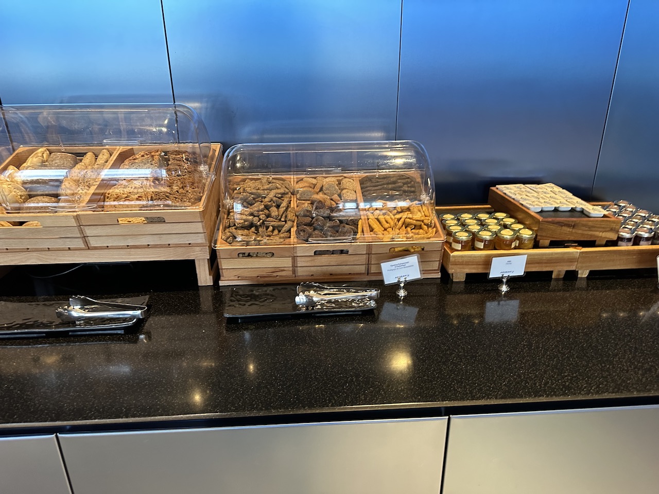Wir waren zu Frühstückszeit da, entsprechende Gerichte und Snacks sind als Buffet aufgebaut. Zur Auswahl standen Obst, Joghurt, Sandwiches, Wraps aber auch warme Dinge wie Suppe oder gefüllte Teigtaschen.