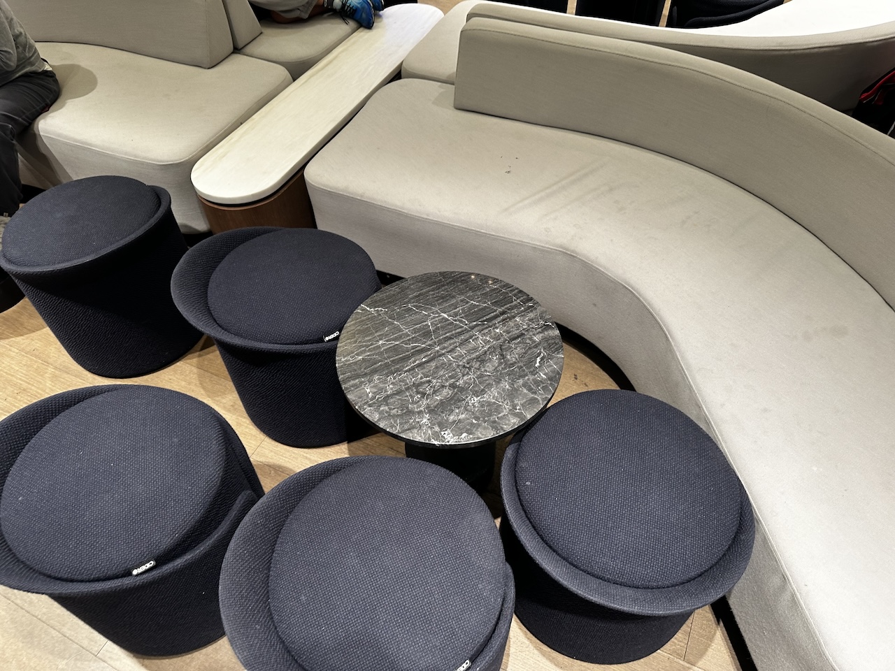 Die breiten Sessel sind da etwas bequemer, davon gibt es aber nur ein paar Exemplare. Die Lounge kann schnell voll werden, zu bestimmten Zeiten wurden in der Vergangenheit die Kunden, die einen gast mitnehmen wollten in eine andere Lounge gebeten und mit Meilen kompensiert.