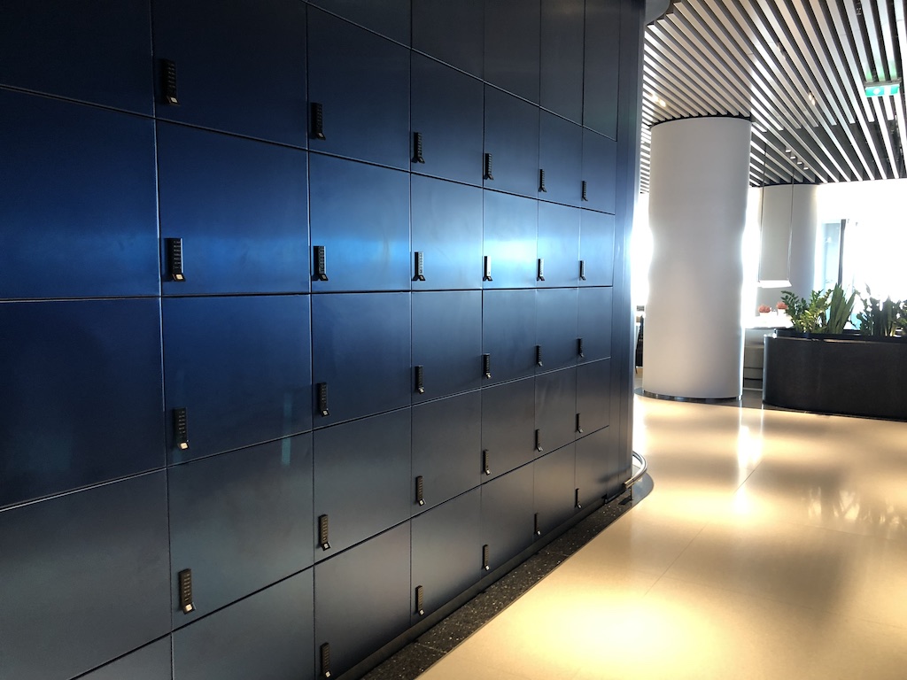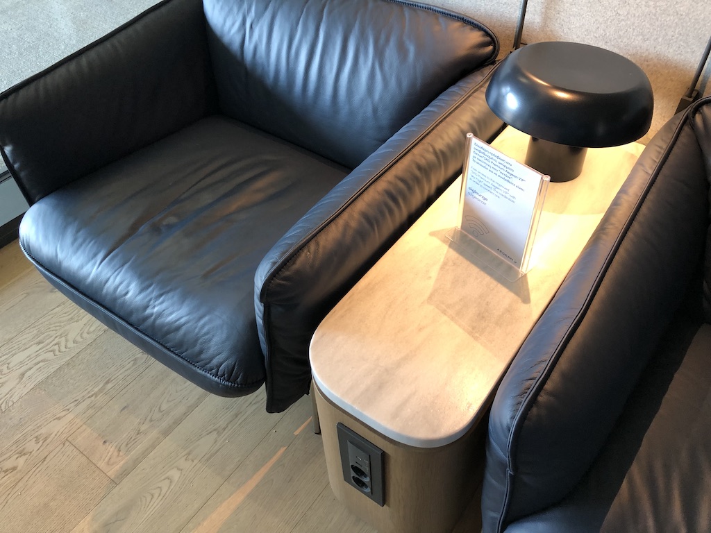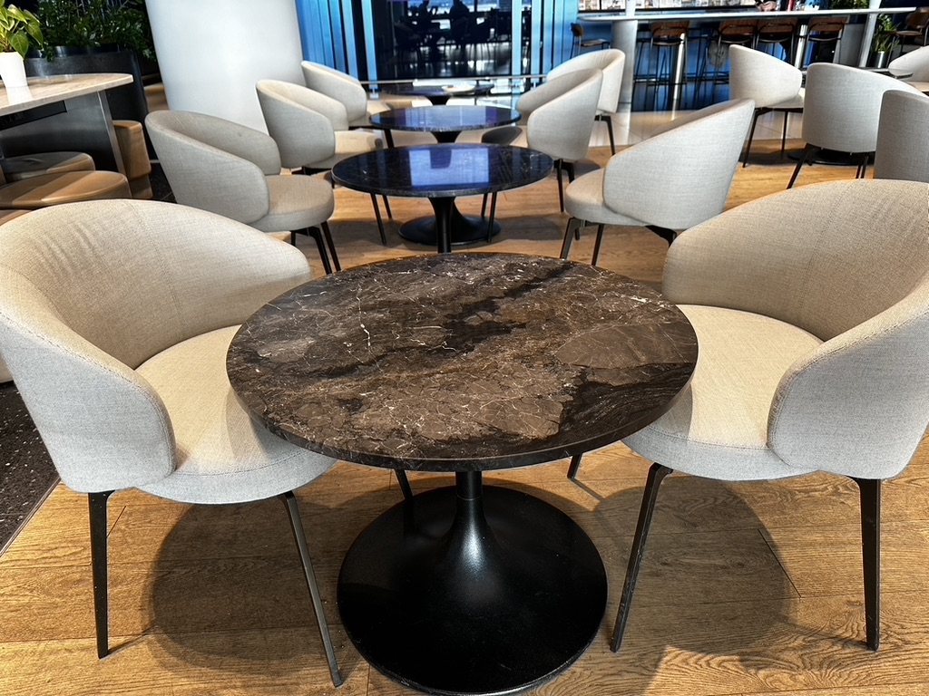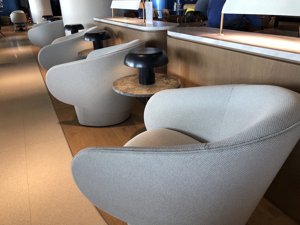 Es gibt diverse Sitzmöglichkeiten am Tresen, Tischen oder mittendrin. Im Eingangsbereich gibt es Schließfächer, dort kann man persönliche Gegenstände verstauen und die Lounge zum Beispiel fürs Shopping im Terminal verlassen.