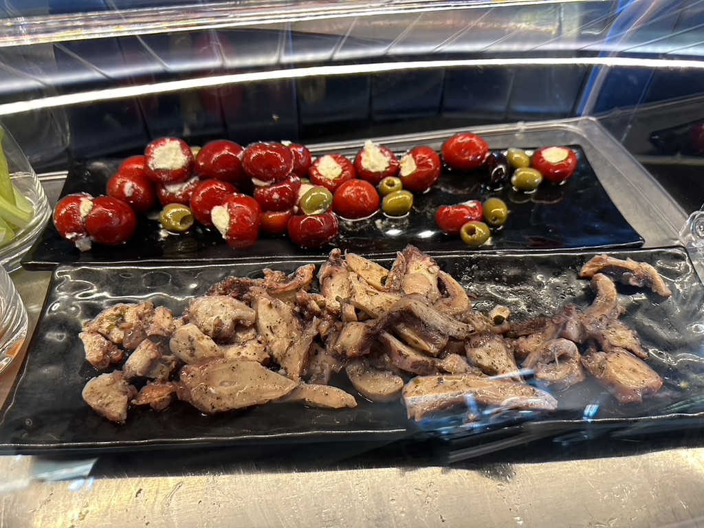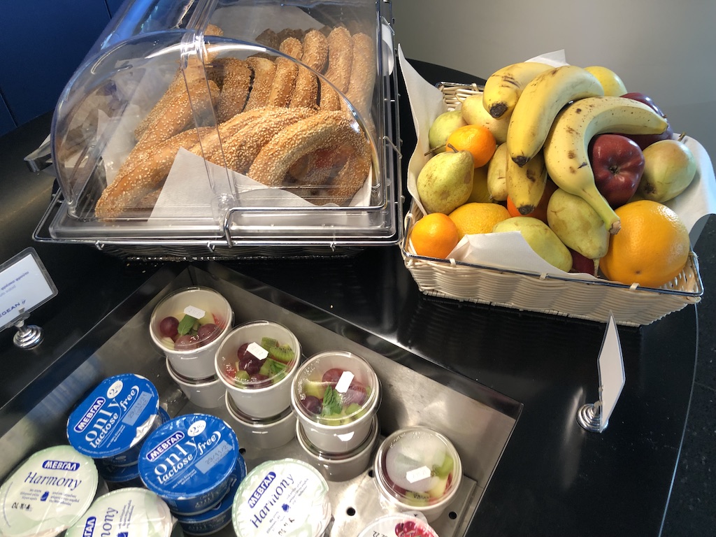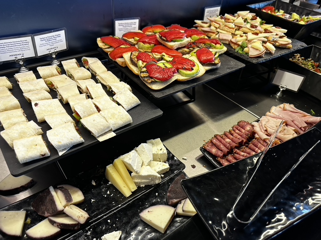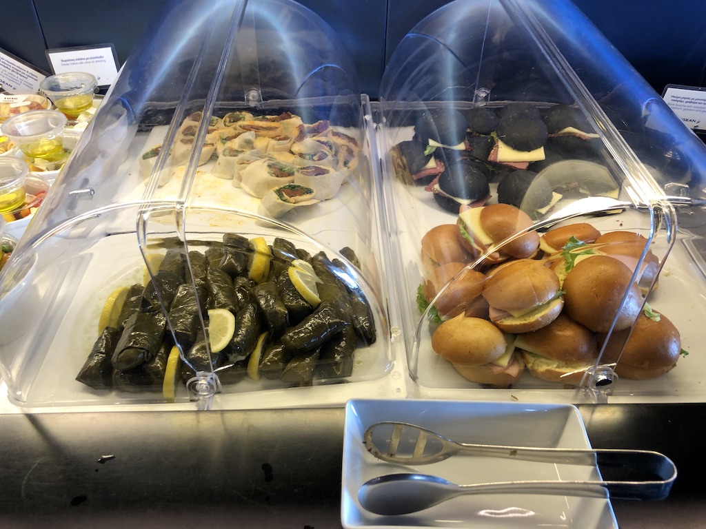 Dabei standen uns warme Speisen wie Spinatkuchen oder Quiche als auch kalte Optionen wie gefüllte Weinblätter, Oktopus, Antipasti, Sandwiches, Obst, Joghurt oder Käse bereit. Ebenso sind Snacks wie Cracker und diverse Riegel erhältlich, es gab zudem einige Desserts.