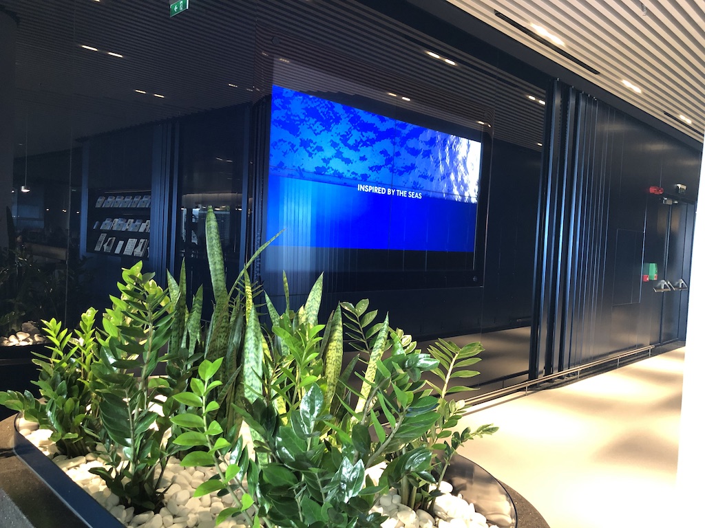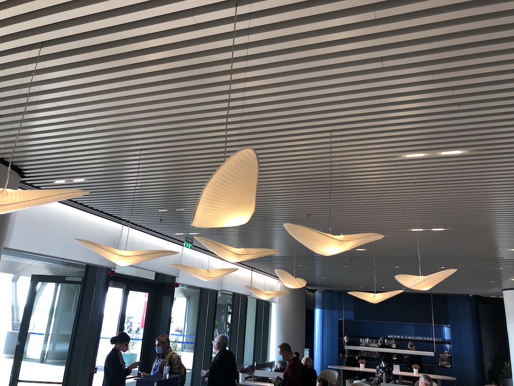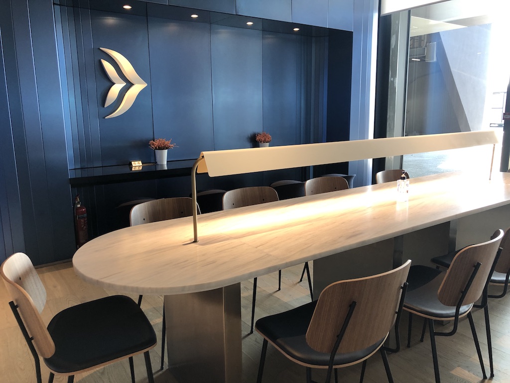 Die dominierende Farbe der Räumlichkeit ist das Blau des neuen Aegean-Logos, die Designer haben auch viel Holz und indirekte Beleuchtung verwendet.