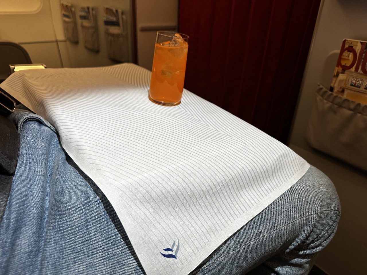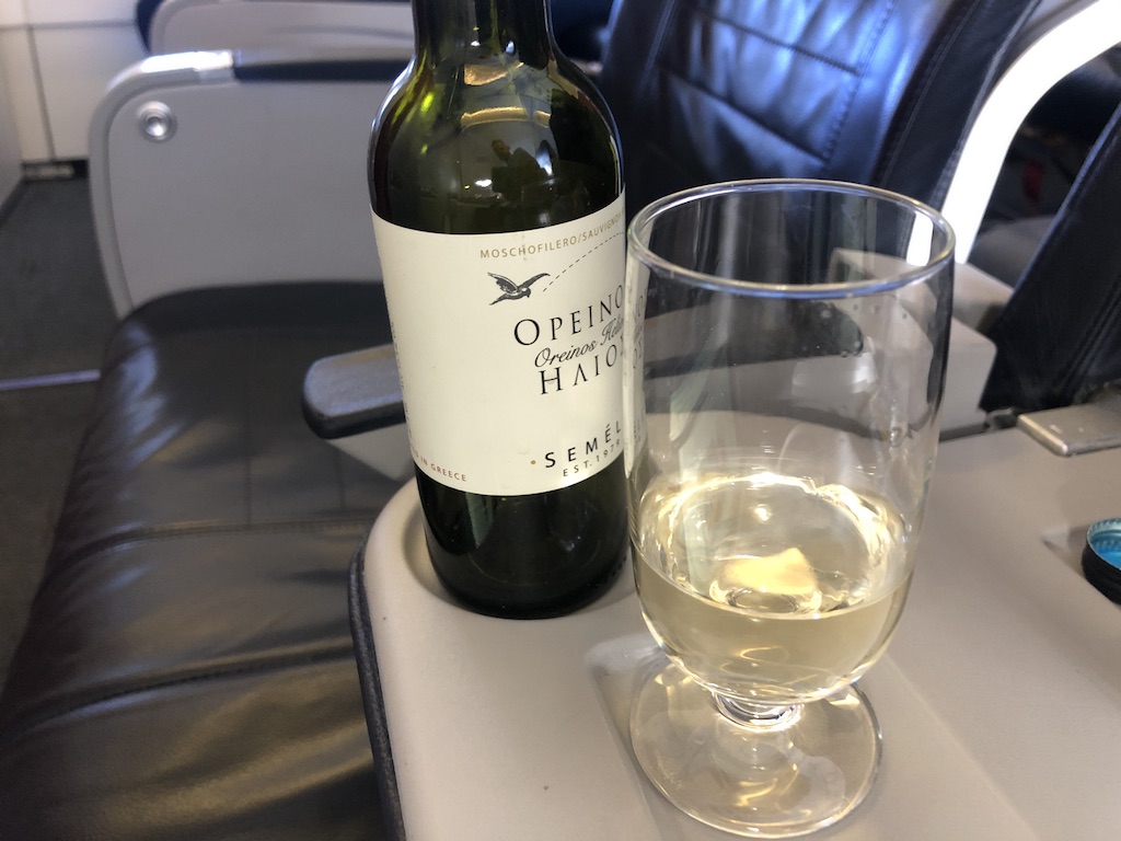 Hier gibt es die meisten Extras und Unterschiede, die Aegean zu einem der besseren Carrier machen. Dies fängt schon am Boden an, auch auf kürzeren internationalen Flügen werden Willkommensgetränke serviert. Neben Saft und Wasser schenkt man Sekt aus, wie bei den Weinen handelt es sich um ein lokales Produkt aus Griechenland.