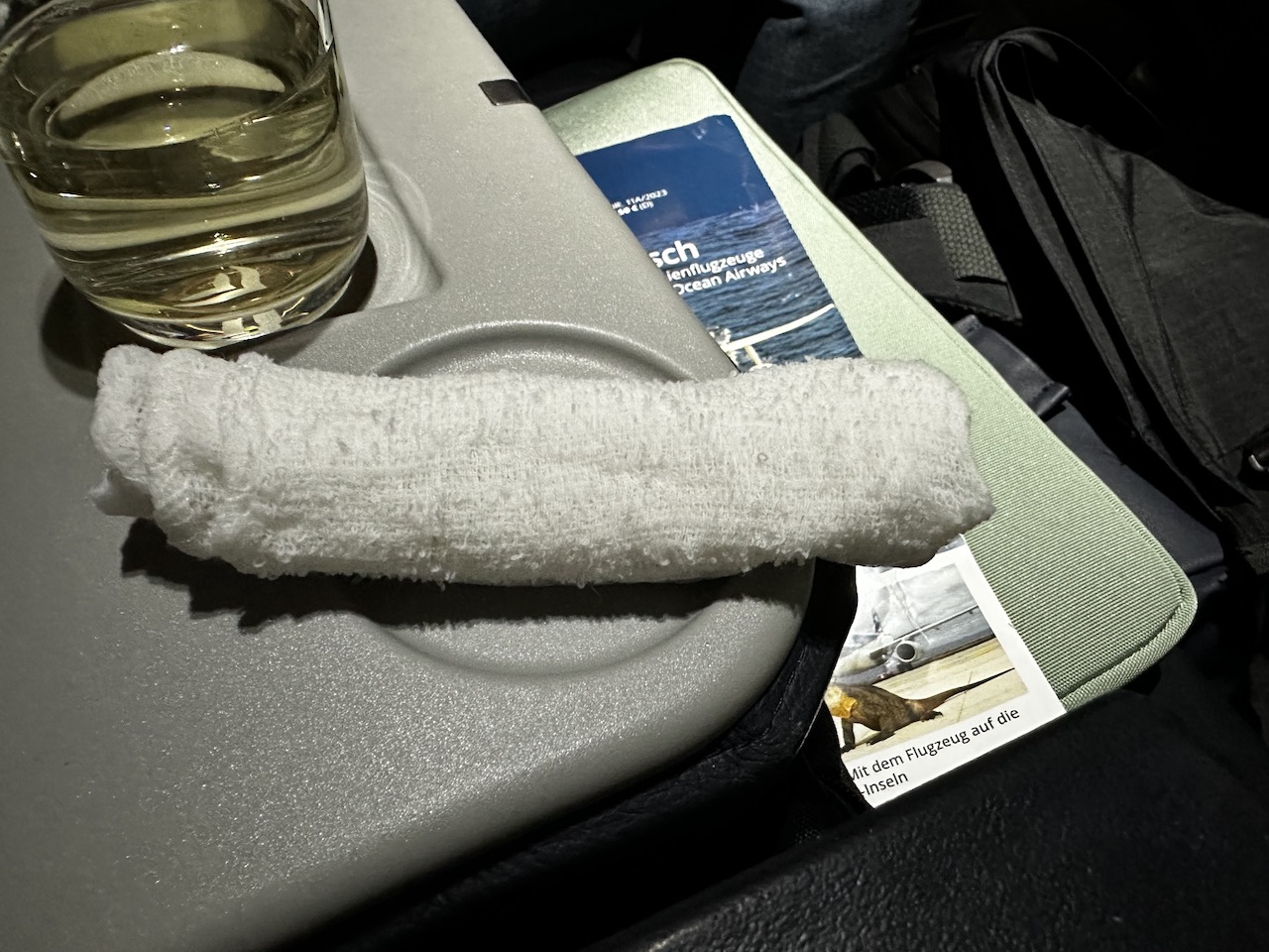 Meist werden vor dem Start auch Speisekarten verteilt, dort ist die recht große Auswahl genauer beschrieben. Nach Take off werden heiße Tücher verteilt, viele Airlines bieten diese erst auf längeren oder interkontinentalen Flügen. Wirklich eine Kleinigkeit, aber immer eine willkommene Geste.