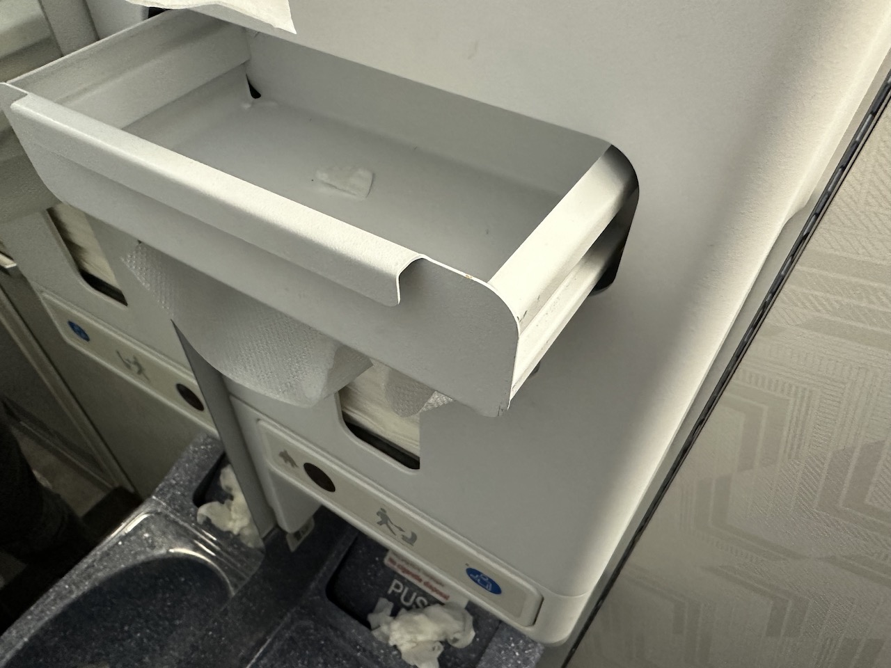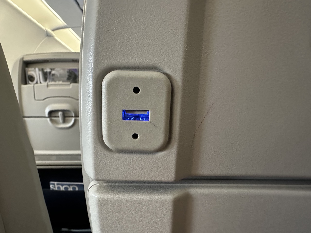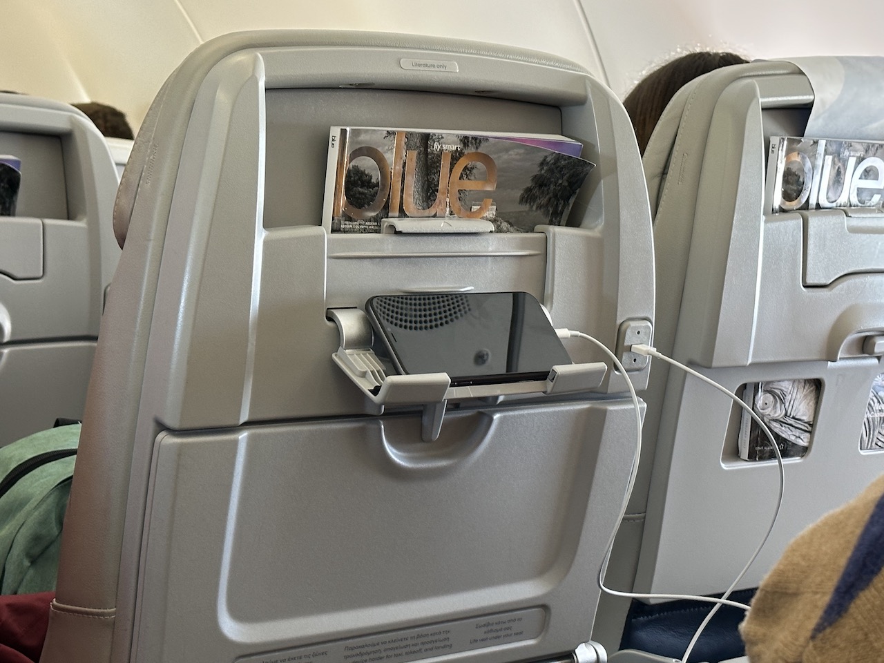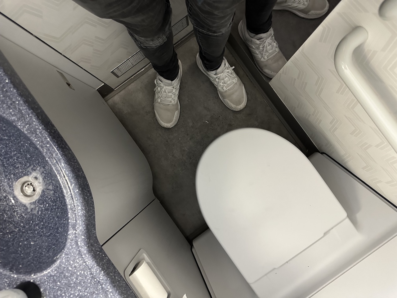 Jeder Sitz hat eine USB-Ladestelle und Halterungen für Smartphones oder Tabletts. Im hinteren Bereich der Kabine sind drei Toiletten installiert, zwei davon wurden quasi in die Galley gebaut und extrem eng. Die Zugangstür der mittleren Lavatory „versteckte“ sich hinter einem Flugbegleitersitz.