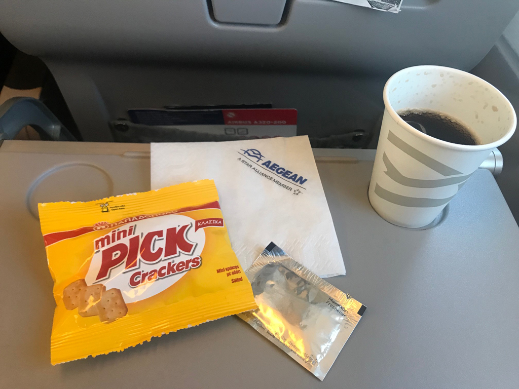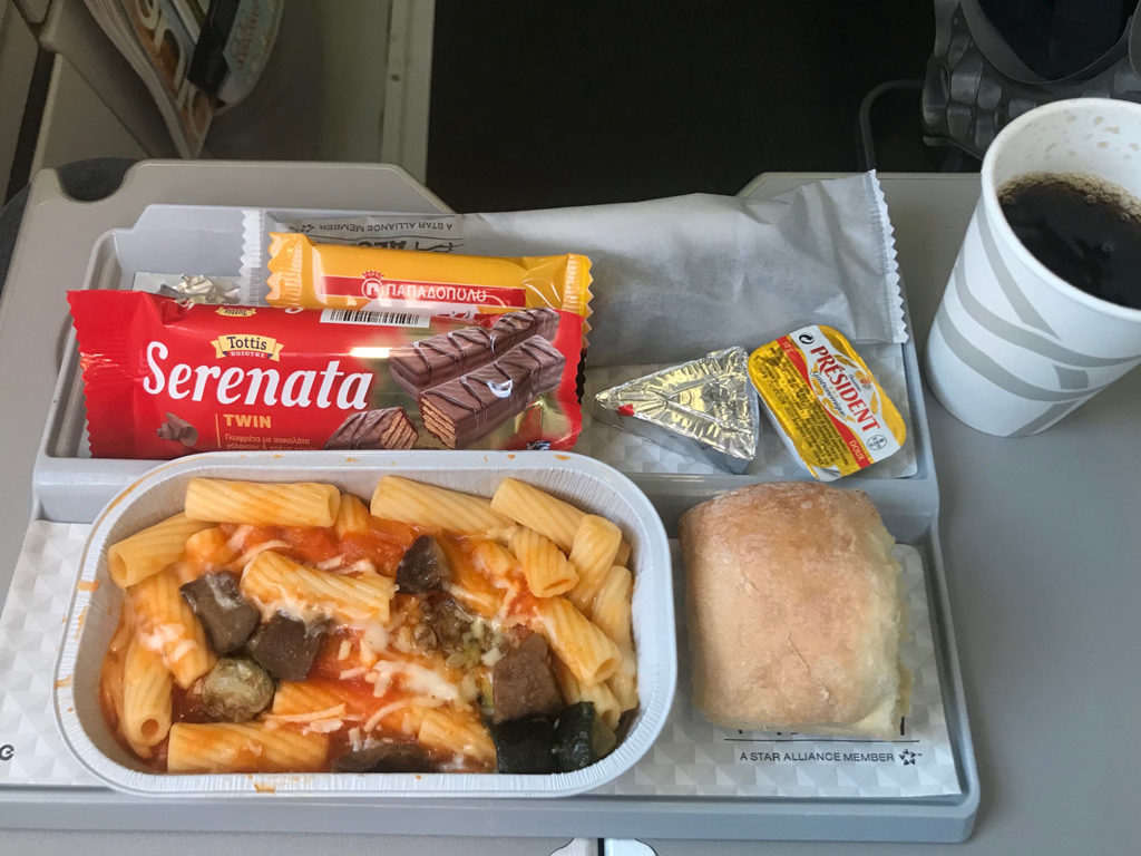 Auf den innergriechischen Kurzstrecken wurden, neben einer Getränkerunde, nur kleine Snacks serviert. Dies reicht aber völlig aus, da die Flüge meist nur zwischen 30 und 60 Minuten lang andauern und somit eine richtige Mahlzeit kaum zubereitet und serviert werden könnte. Zwischen Thessaloniki und Frankfurt wurde dann am frühen Abend eine warme Mahlzeit, bestehend aus Pasta mit Käse und Gemüse, einem Brötchen und einem Schokoriegel serviert. Hier gab es zwei Getränkerunden.