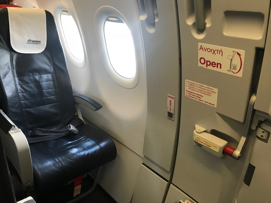 Zwei der drei Flüge verbrachte ich am Notausgang. Im A320 ist dieser an den Sitzreihen 11 und 12 platziert. Im A321 gibt es, wie auf der Seatmap ersichtlich, drei Notausgangsreihen. Ich wählte für den Mittelstreckenflug von Thessaloniki nach Frankfurt (Main) den Platz 10A, der ein Maximum an Sitzabstand bietet und von dem man zudem aufstehen kann, ohne die Sitznachbarn zu behindern.