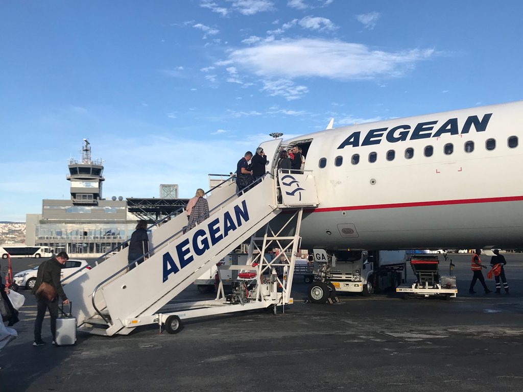 Das Boarding verläuft allgemein bei Aegean in zwei Reihen – eine für Gäste der Economy Class und eine für Statuskunden und Business Class-Gäste. Auffällig ist, dass bei jedem Fluggast der Boardingpass stets mit einem Ausweisdokument verglichen wird.