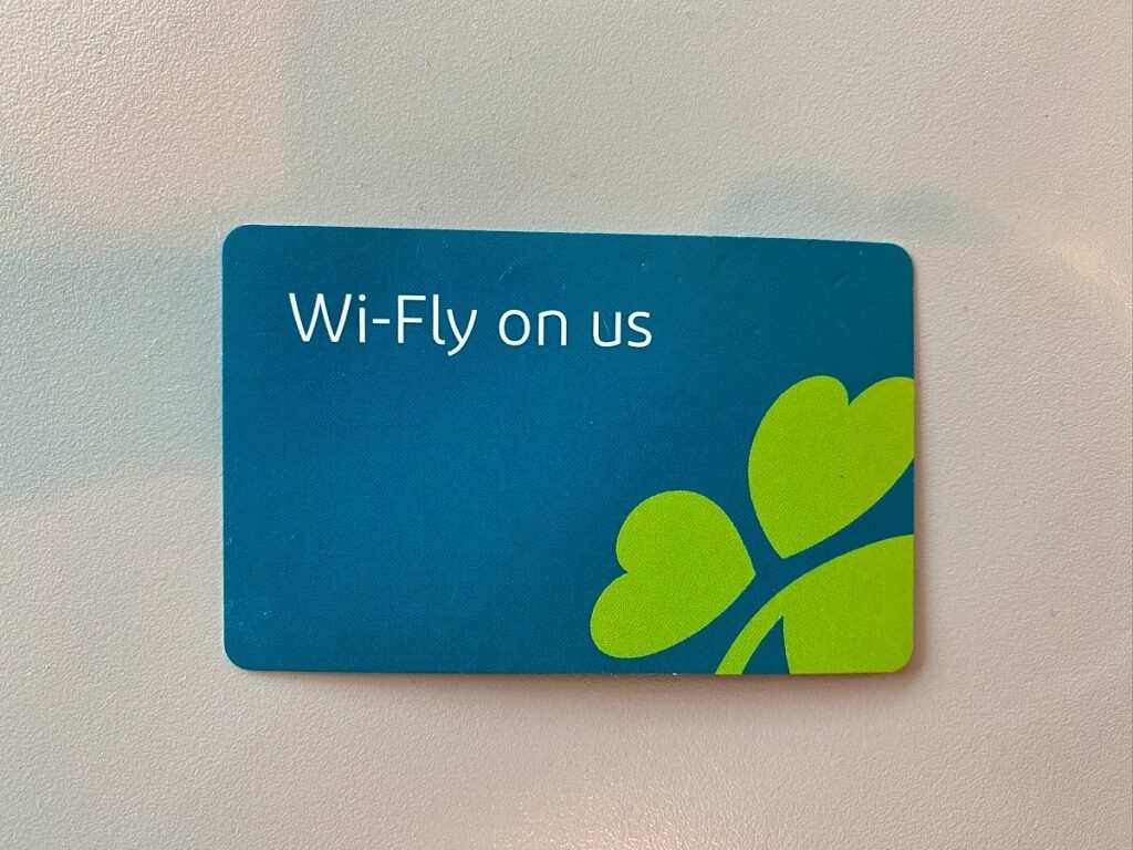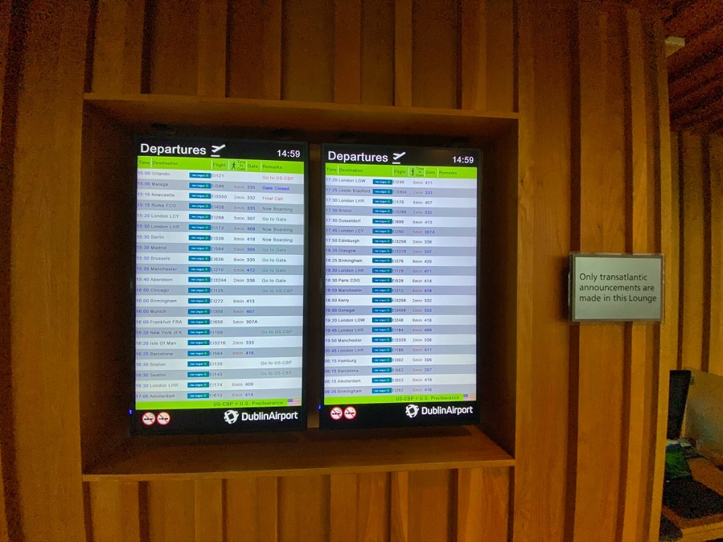 Hier bietet die Lounge zum einen die Anzeigetafel der Aer Lingus Abflüge und gratis WLAN. Für letzteres liegen in verschiedenen Punkten in der Lounge kleine Visitenkarten verteilt. Dort sind die SSID und ein zulässiges Passwort aufgedruckt.