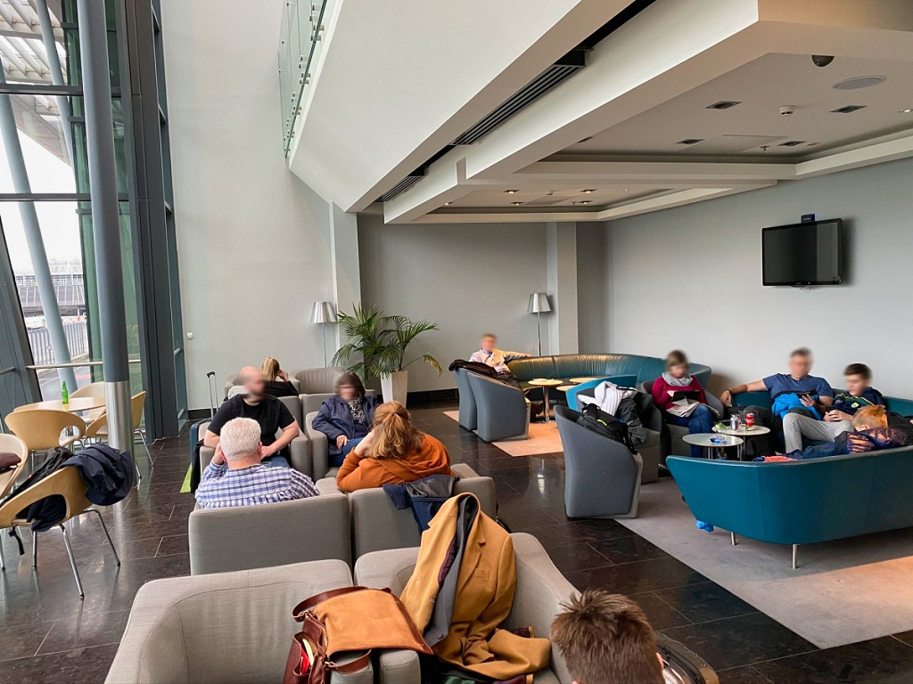 Naja, einen Stockwerk über der „Hauptlounge“ ist es etwas ruhiger und es gibt eine kleinere Selbstbedienungstheke (ohne alkoholische Getränke). Auf Sesseln entlang der Fenster kann man dem Treiben auf dem Vorfeld zusehen.