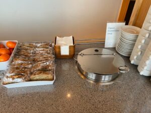 Das Catering bietet solide Auswahl für eine Business Lounge. Auch von der Qualität ist das absolut in Ordnung. Es gibt Warmes, Kaltes, Süßes und Herzhaftes. Wer mit Suppe und Brot klarkommt, bekommt auch eine vollwertige Mahlzeit zusammen. Im Gegensatz zu den Priority Pass Lounges in Dublin gibt es hier freien Zugang zu alkoholischen Getränken und auch die Speisen scheinen etwas hochwertiger. Hier merkt man, dass Aer Lingus in die Lounge investiert hat seitdem die Airline im Verbund mit den anderen Fluggesellschaften der IAG Group aufgebaut wird und ihr Transatlantikgeschäft ausgebaut hat.