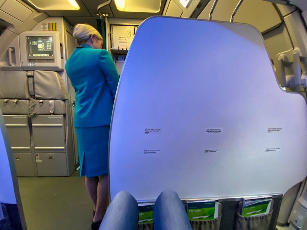 Reihe 1 ist nicht automatisch das Nonplusultra. Beileibe nicht. Bei Aer Lingus hat die ersten Reihe folgende „Features“: Direkt davor ist die Trennwand zur Galley. Wer gerne weiße Wände anstarrt kommt hier garantiert auf seine Kosten. Weil hinter der Trennwand die Galley ist, hat ist die Wand auch bodentief, d.h. nach vorne ist für die Füße großer Menschen gar nicht einmal so viel Platz.