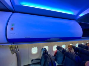 An der Wand befinden sich dann drei Netztaschen, um die Sicherheitskarte, das Bordmagazin und einen Duty Free Prospekt zu halten. Stauraum Fehlanzeige. Im Fußraum darf man bei Start und Landung auch nichts haben. Daher muss alles in die Overhead Bin. Wie gut, dass der Platz da reserviert ist. Auf meinem Flug war die Reihe hinter mir übrigens frei, da habe ich dann ein kleines Täschchen in den Fußraum der Reihe hinter mir gelegt. Aber denkste. Das missfiel den Damen von vorne sogleich und ich wurde zurechtgewiesen, dass Passagiere in Reihe 1 nichts im Fußraum ablegen dürfen. Auch nicht, wenn sie dafür den freien Fußraum der Reihe 2 nutzen. Ist klar. Es gibt halt Regeln.
