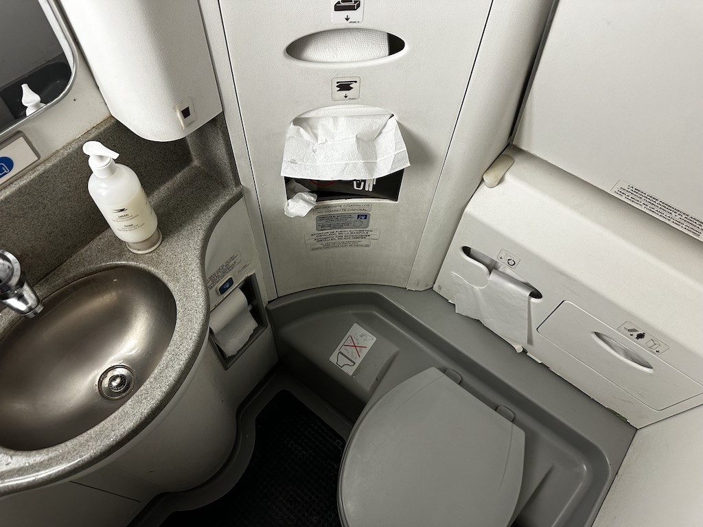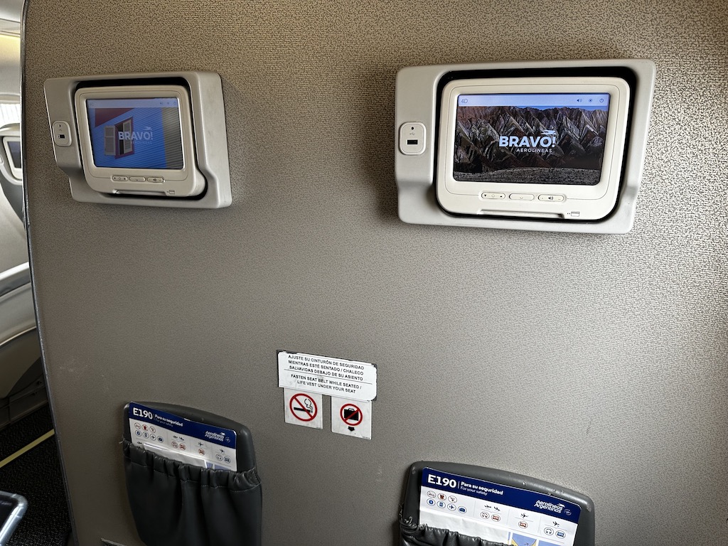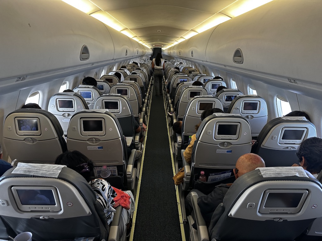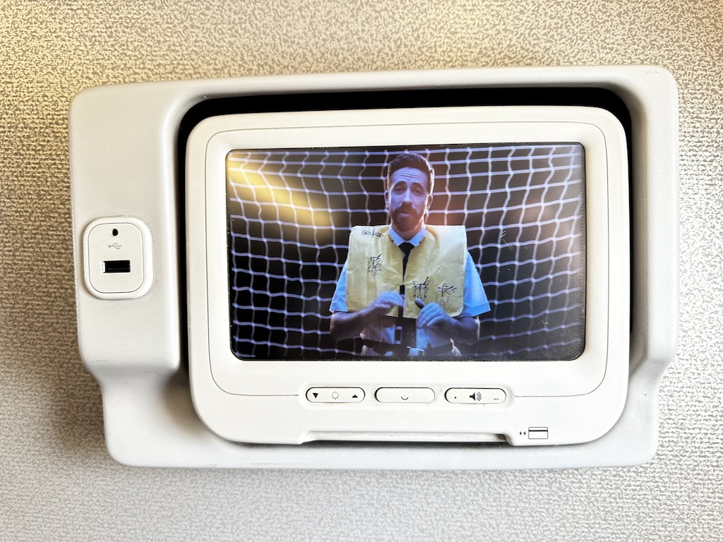 Alle Sitze haben kleine Monitore, Kopfhörerbuchsen sowie USB-A Anschlüsse. Das Flugzeug war schon etwas betagt, die Kabine war aber sauber und gepflegt.