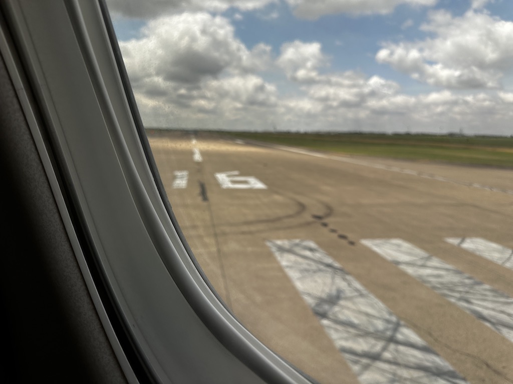 Der Stress ging zunächst weiter, noch während das Sicherheitsvideo lief, bogen wir auf die Startbahn und hoben ab.