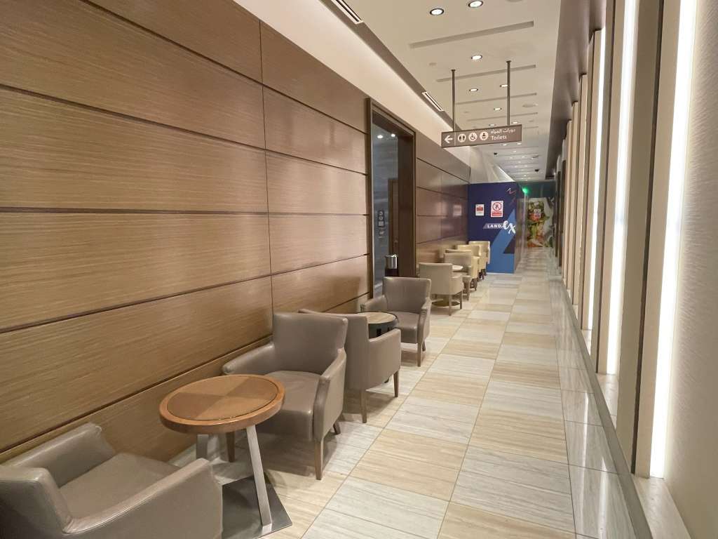 Die Ahlan Lounge ist genau der Typ von Lounge, der mir üblicherweise nicht so sehr liegt. Denn die komplette Einrichtung ist in einem langen Schlauch untergebracht. Das klingt aber zunächst schlimmer als es ist, denn dieser „Schlauch“ ist zum einen sehr breit und zu anderen immer wieder in unterschiedliche Bereiche aufgeteilt.