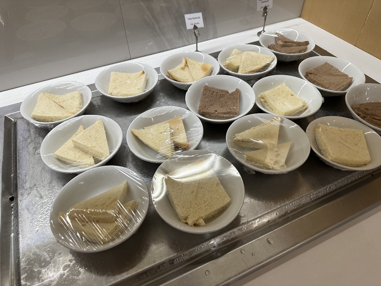 An einem Buffet stehen verschieden Speisen bereit, viel kalte Snacks und Mahlzeitenbestandteile sind schon portioniert.