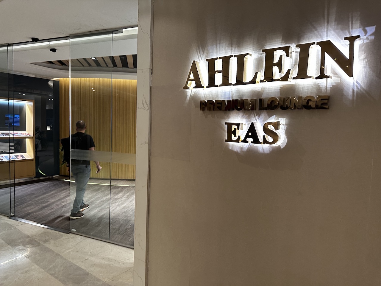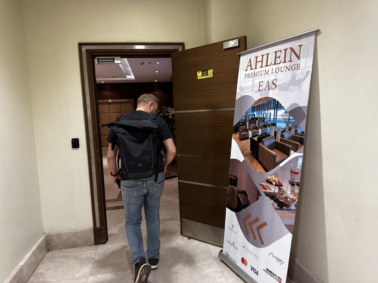 Die Lounge liegt im Sicherheitsbereich, nach den Kontrollstellen weisen einige Schilder den Weg. Wir sind quasi durch die Lounge von Platzhirsch Egyptair durchmarschiert und kamen an den Tresen von Ahlein. Dort haben wir die Einladungskarten, welche wir am Check-In erhalten haben, abgegeben und durften weiter.