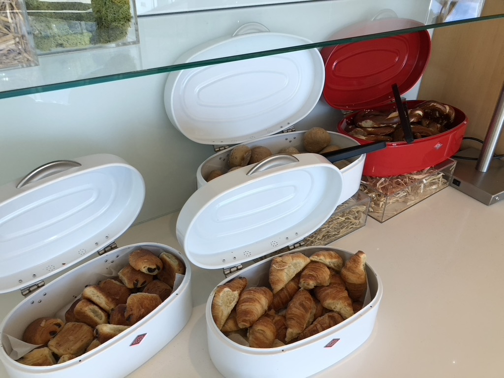 Gegen Mittag standen gab es noch einige Frühstücksbestandteile wie Croissants und Marmelade, es gab aber auch Salate, Sandwiches und Obst.