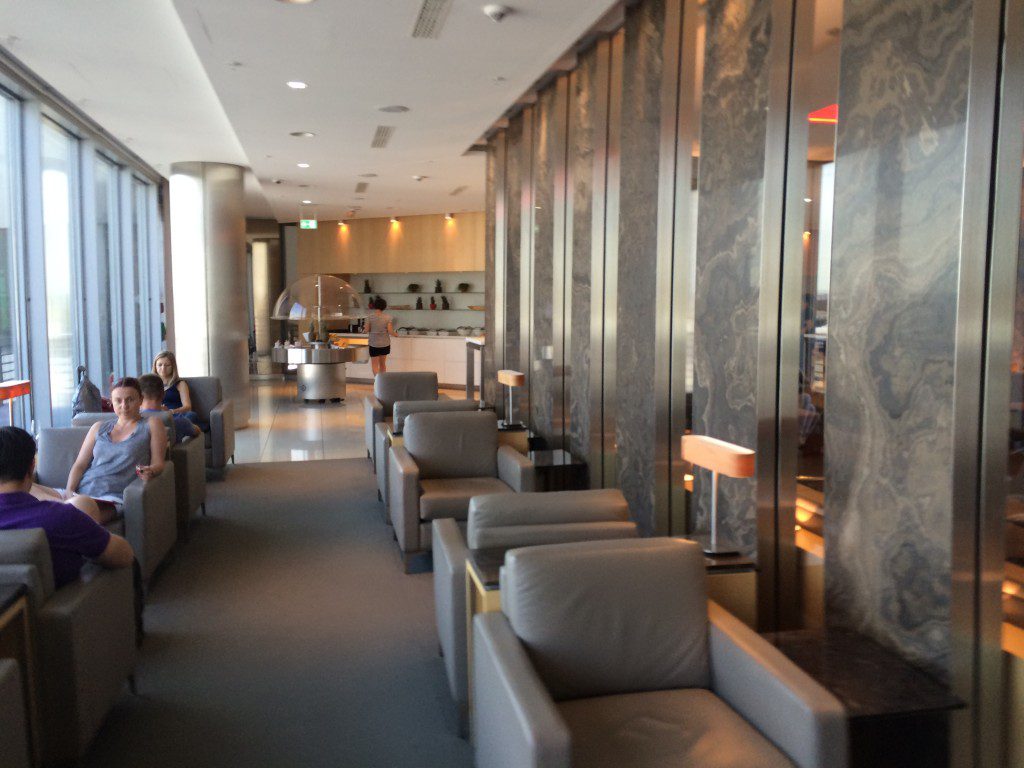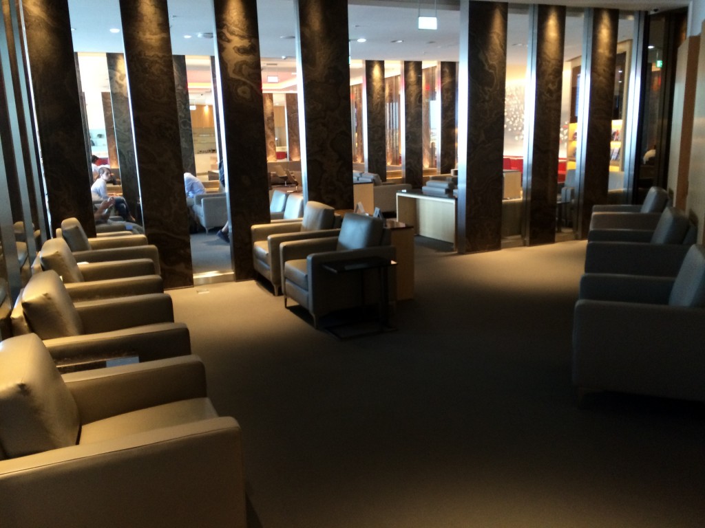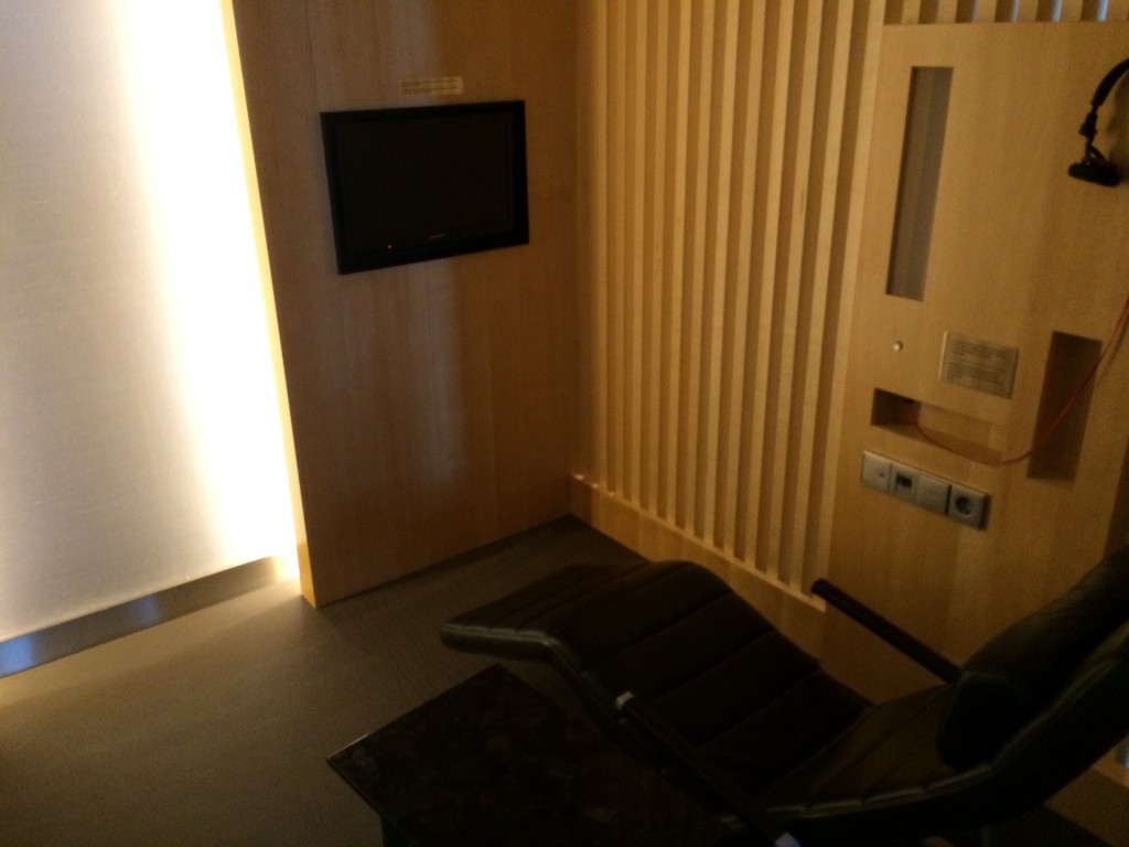 Es gab verschiedene Sitzgelegenheiten innerhalb der Lounge. Neben Lounge Sessel an der deckenhohen Fensterfront mit Blick auf das Vorfeld, gab es auch im hinteren Bereich eine etwas dunklere Zone mit Sesseln. Hier befand sich auch der Ruhebereich, in welchem sich auch kleine abgetrennte„Cabanas“ befanden. Diese waren mit einer Liege ausgestattet, auch ein kleiner Fernseher mit Kopfhörern hing an der Wand, sodass man hier auch eine längere Zeit verweilen kann.