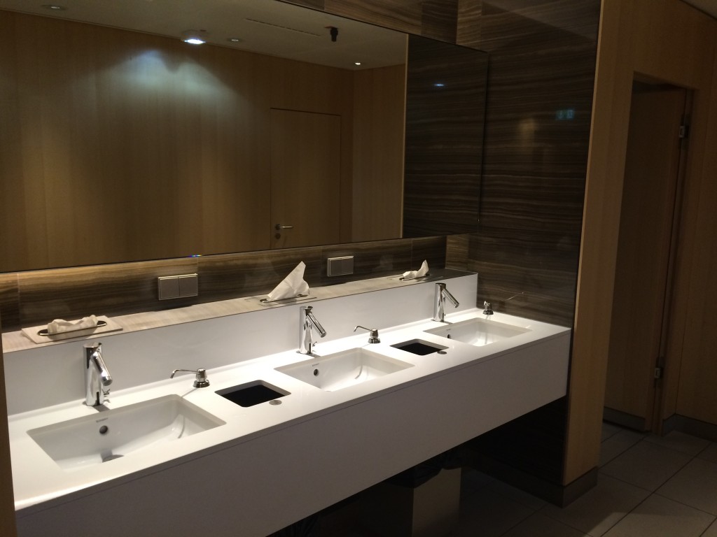 Die Bäder in der Lounge sind sehr gelungen und hier fiel mir auf, wie sehr doch alles nach Air Canada aussah. Die Holzoptik der Fliesen an der Wand erinnerte mich sehr an die neue 777 und 787 von Air Canada.