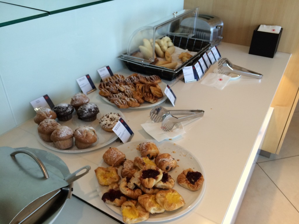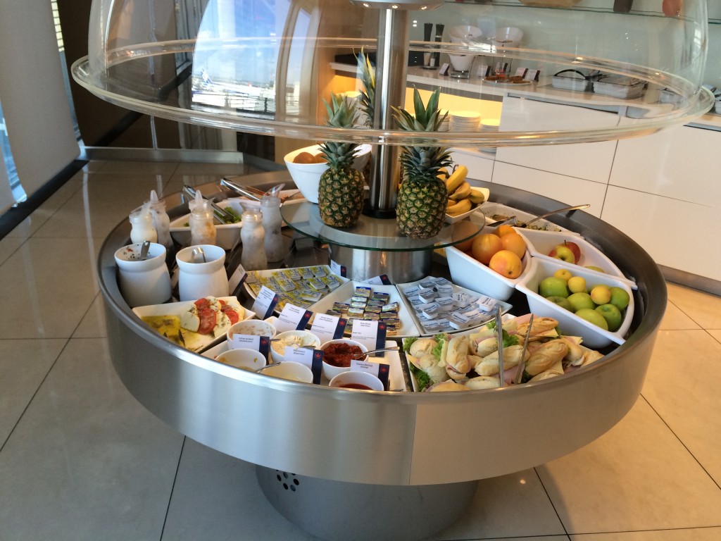 Der Buffetbereich mit den Speisen hatte, insbesondere für eine Business Lounge einiges zu bieten. Es gab eine Insel mit Salaten, Obst, Sandwiches und Dips.