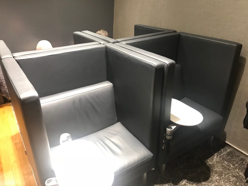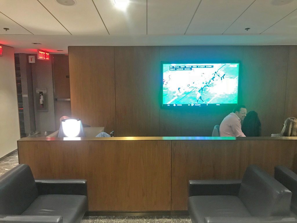 Dazu gibt es in der Lounge diverse Sesselbereiche, in denen man vor dem Flug etwas entspannen und bzw. oder eine Mahlzeit einnehmen kann. Zudem gab es in einem Eckbereich einen Fernseher, auf dem während meines Besuches ein Fußballspiel einer kanadischen Mannschaft live übertragen wurde.