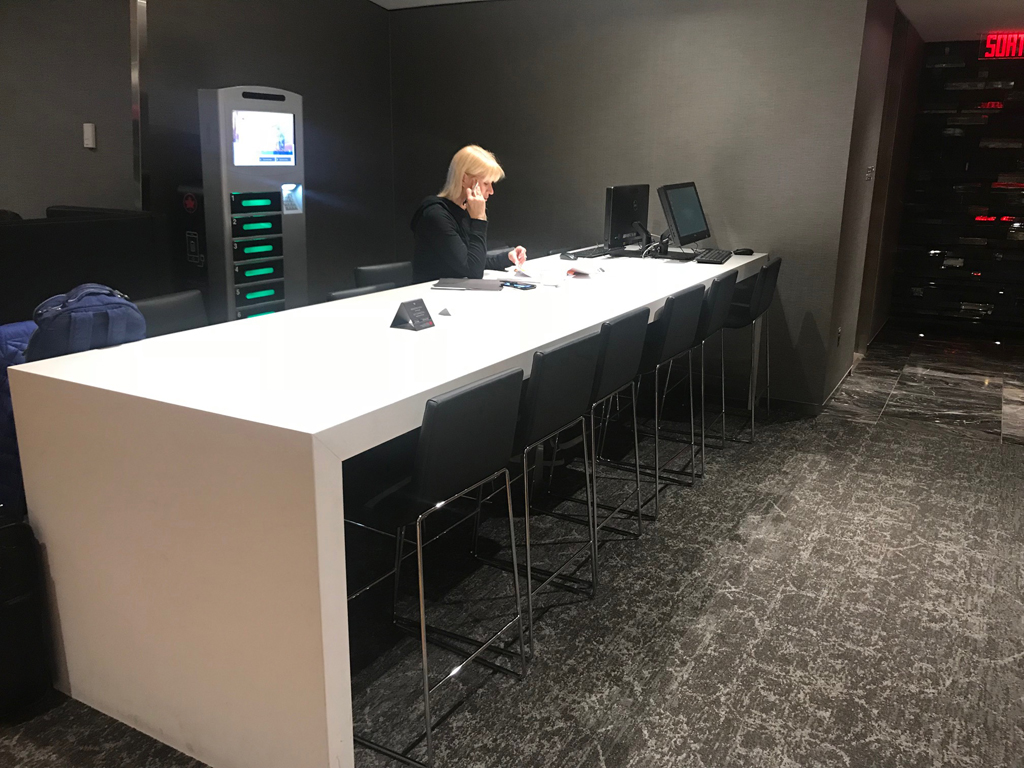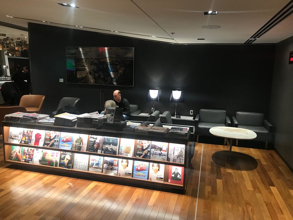 Die Lounge machte schon beim Betreten einen sehr modernen und ansehlich gestalteten Eindruck. Hinter der Rezeption werden Gäste von einem großen Air Canada Dreamliner-Flugzeugmodell begrüßt. Zum Lesen während des Aufenthaltes steht zudem ein Zeitungs- und Zeitschriftenregal mit vielen Printmedien bereit.