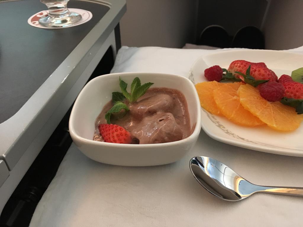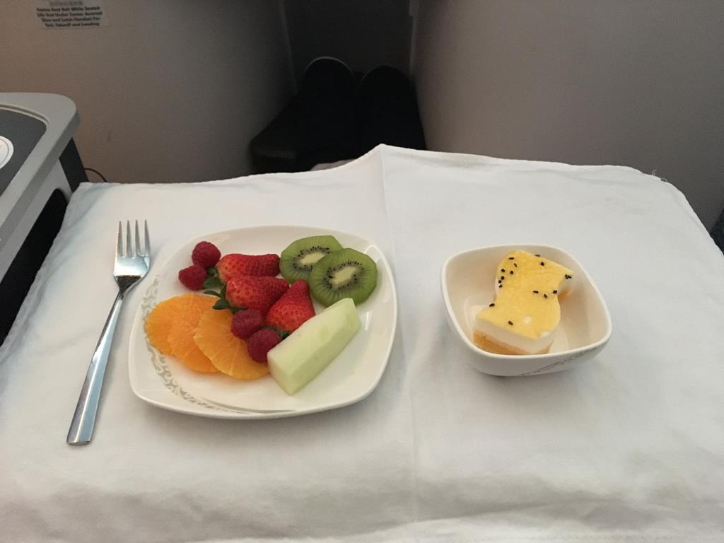 Neben dem mehrgängigen Mittagsmenü bietet man auch noch diverse Snacks und eine leichtes Frühstück vor der Landung an, welches ich habe ausfallen lassen um zu schlafen.