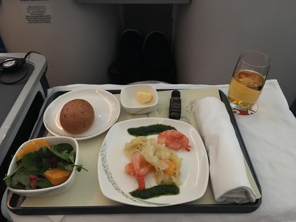 Direkt nach dem Einsteigen begrüßte mich eine freundliche Flugbegleiterin auf Englisch und führte mich zu meinem Platz. Nachdem ich es mir bequem gemacht hatte wurde mir direkt ein Champagner und ein warmes Tuch angeboten um mich frisch zu machen. Anschließend wurde die Speisekarten überreicht und weitere Getränke angeboten.