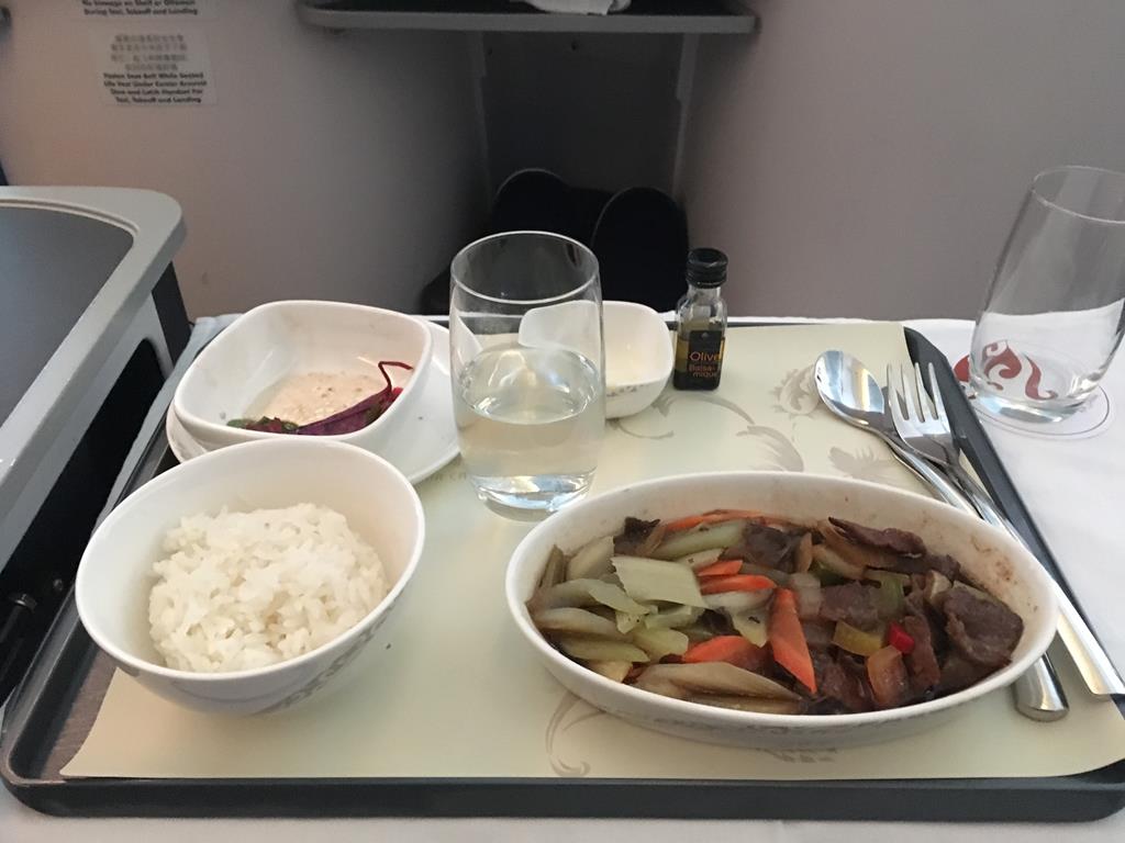 Beim Menü konnte man zwischen einem westlichen und einem asiatischem Menü wählen. Im Falle von Air China habe ich mit beiden Menüs bereits meine Erfahrungen gemacht. Grundsätzlich tendiere ich aber immer zum Menü der regionalen Herkunft der Airline und fahre hiermit stets sehr gut.