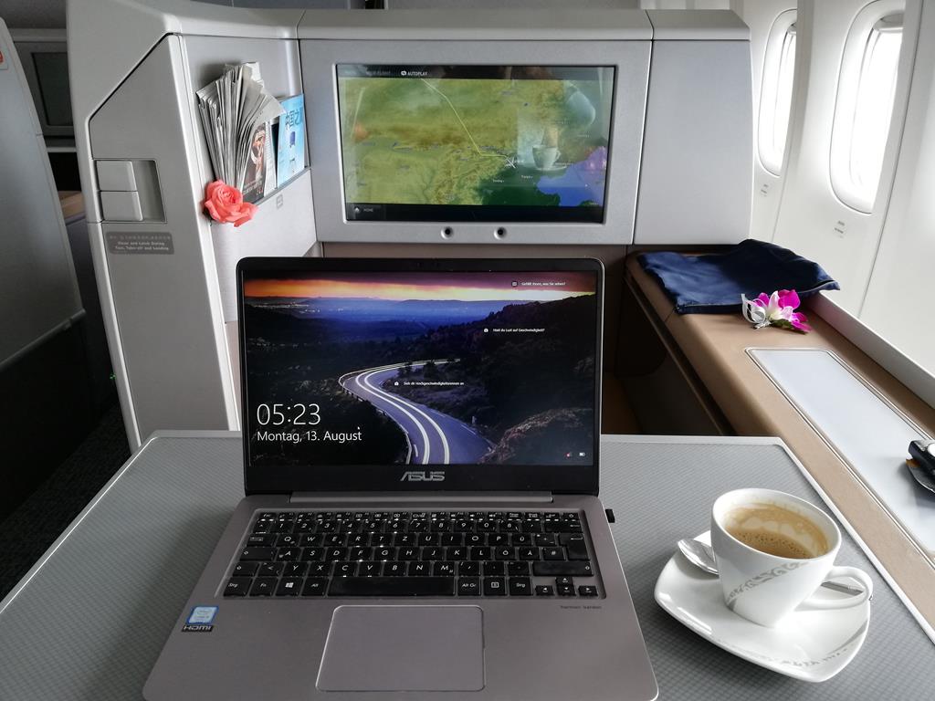 Ich selbst bin nach guten sechs Stunden, etwa 40 Minuten vor der Landung aufgewacht. Der Schlaf war aufgrund von Turbulenzen etwas unruhig. Zudem war es mal zu warm und mal zu kalt in der Kabine, beziehungsweise unter der Decke. Direkt war eine der netten Flugbegleiterin zur Stelle und bat mir an das Frühstück zu servieren. Neben eine Cappuccino (Nescafe) gab es ein Müsli und ein paar Früchte. Nach dem Abendessen, war ich nicht wirklich hungrig.