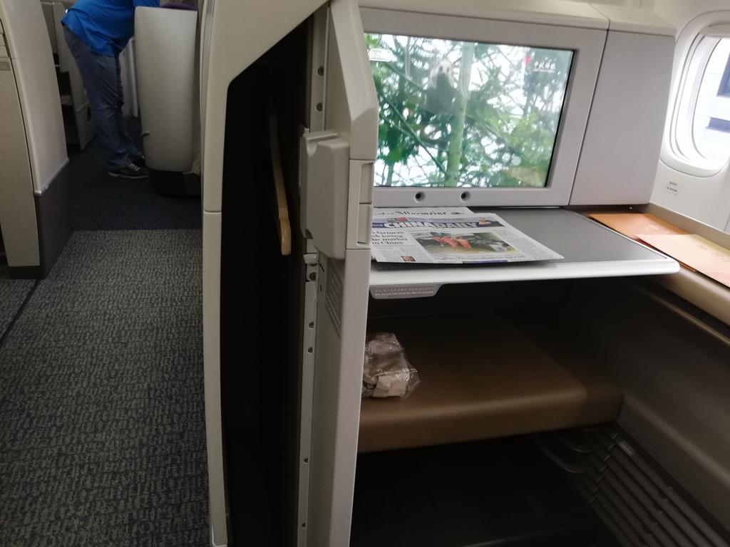 Wir stiegen über die zweite Tür ein und wurden sofort von der Crew begrüßt und nach links in die First Class begleitet. Dabei wollte man uns sofort alle Taschen abnehmen und sogar unsere Koffer in die Gepäckablagen legen.