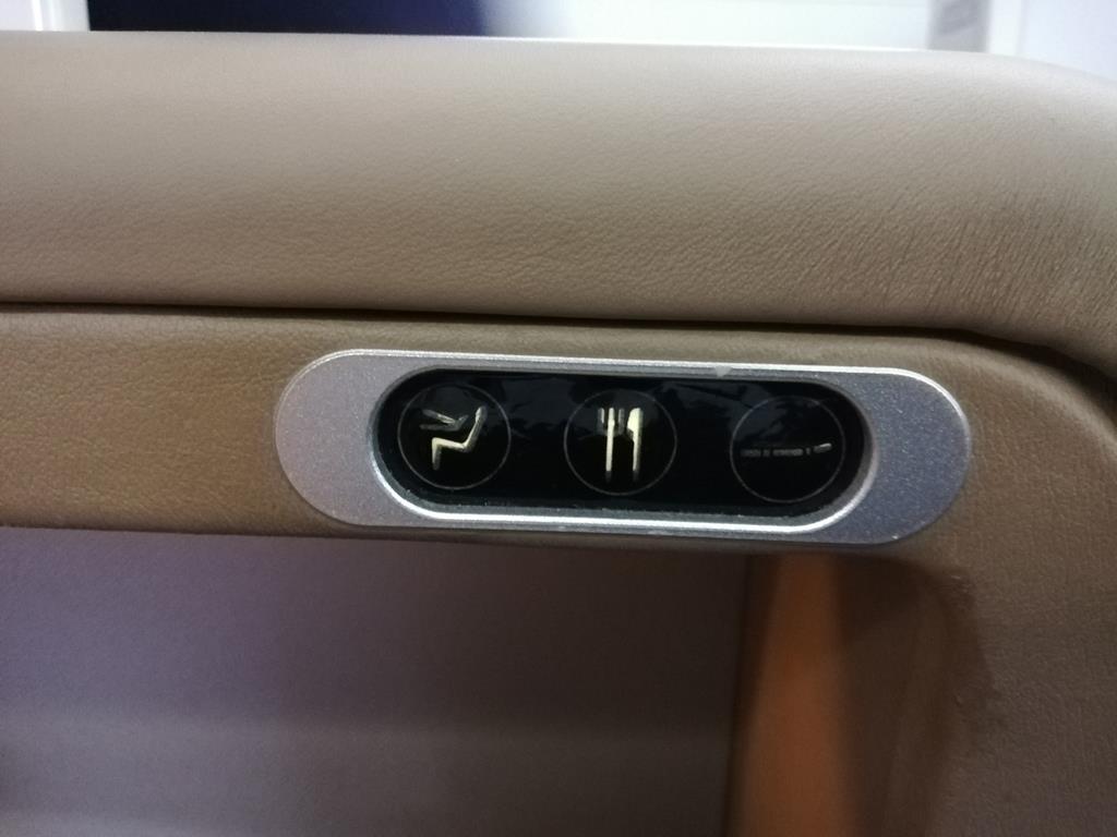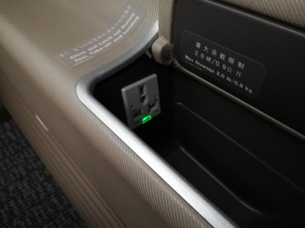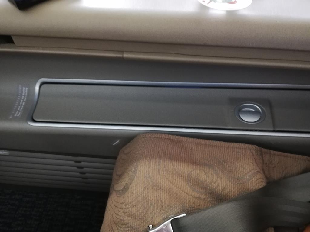 Die Air China First Class in der Boeing 747-8 Sitz ist mit einem hellbraunen Stoff bezogen und dabei recht bequem, wenn auch von der etwas härteren Seite. Unter der linken Armlehne befindet sich ein Staufach mit einer Flasche Wasser, auf anderen Seite ein kleineres Fach mit dem Controller für das Inflight Entertainment, einer Steckdose, sowie zwei USB Anschlüssen.
